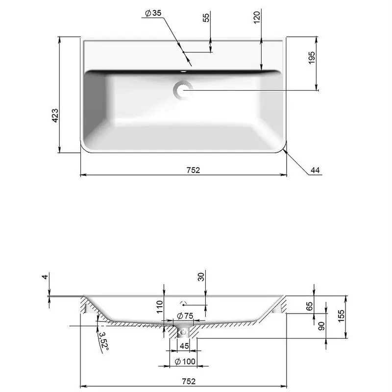 Умывальник AquaRodos Deep 75 см, прямоугольный, белый, искусственный камень