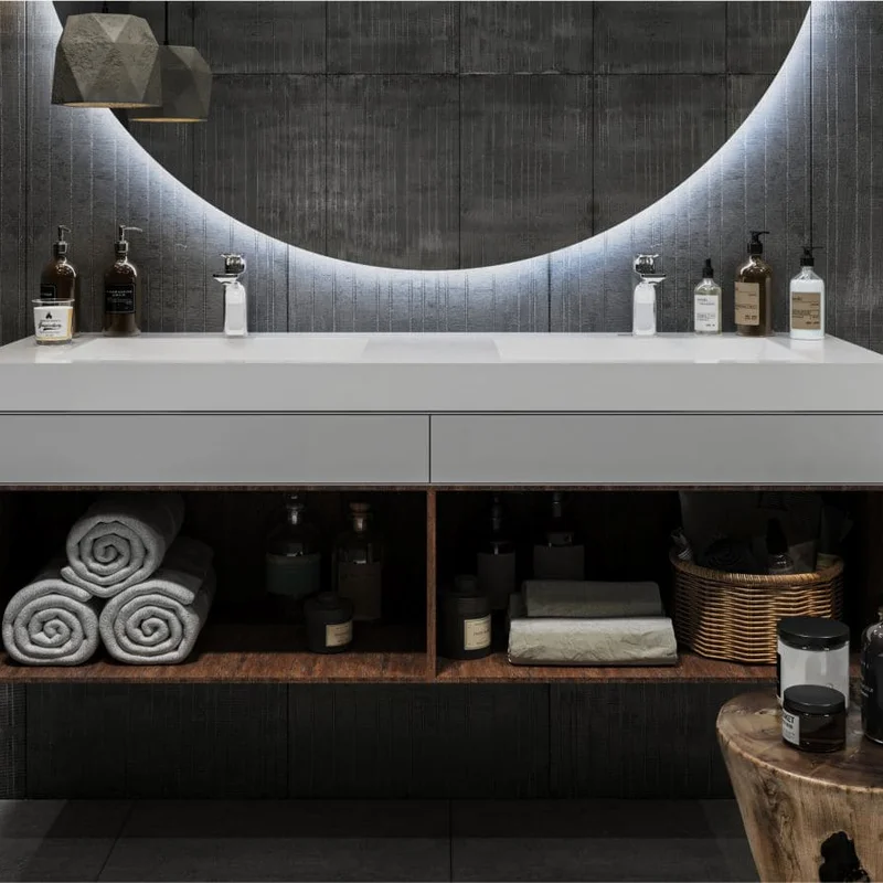 Деякі моделі умивальників можуть бути виготовлені з кварцового піску - в чорному або сірому кольорі. Такі вироби ідеально пасуватимуть ванній кімнаті в стилі лофт.