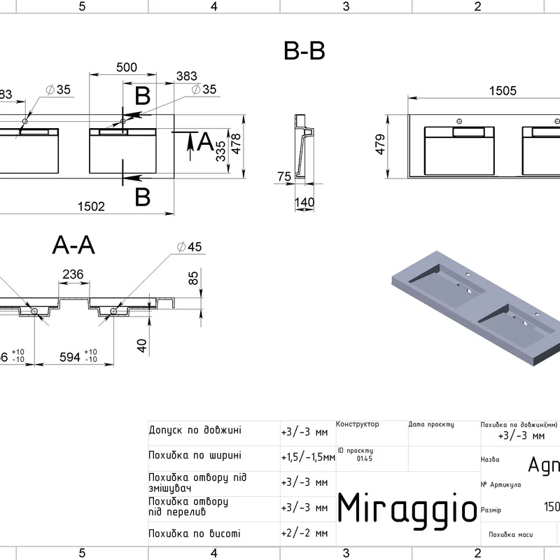 Умивальник AGNESS 1500 MIRASOFT Miraggio