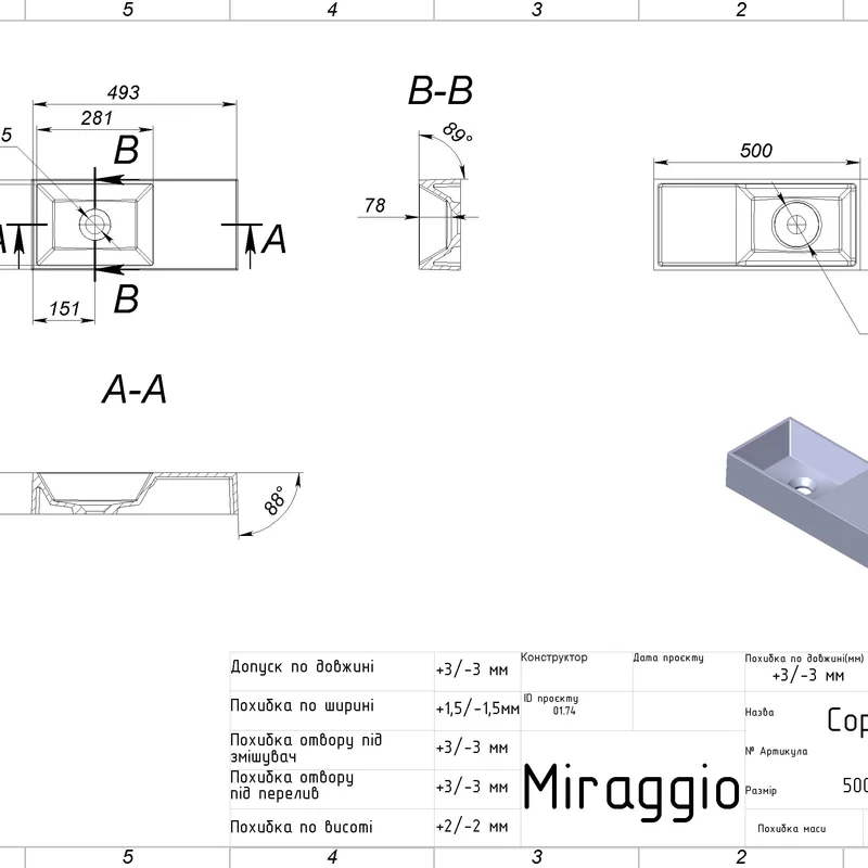 Умивальник COPPER 500 MIRASOFT Miraggio