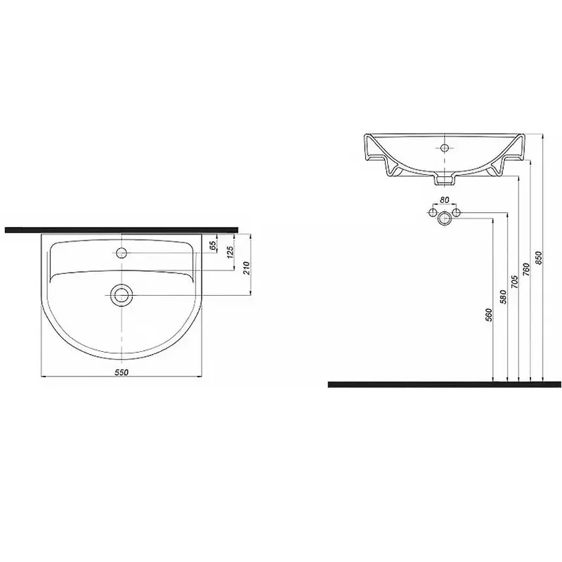 - Розміри умивальника складають 55х43х20 см, що дозволяє встановити його навіть у невеликих приміщеннях.