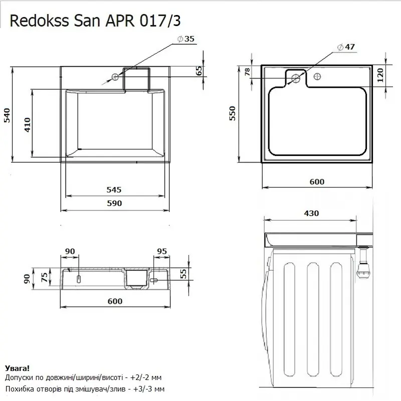 Умивальник Redokss San DEYMOS 550 для встановлення над пральною машиною до 45 см.Умивальник з литого армованого акрилу Redokss San — надійне рішення для встановлення над пральною машиною. Міцний матеріал, зручна форма та сучасний дизайн забезпечують комфортне використання у компактному просторі. Широкий вибір моделей під будь-який розмір пральної машини.Переваги: - Мала вага - до 5 кг;- Зберігає колір весь час експлуатації; - Водонепроникний матеріал; - Екологічно чистий; - Легко чиститься, стійкий до зношування навіть у разі використання поза приміщенням;- Простий монтаж.Характеристики:Матеріал: Акрил високої якостіКолір: БілийГабарити:Довжина: 60см.Глибина: 55см.Висота: 9см.Комплект містить: сифон, кріплення.Колір може будь-яким із палітри RAL — під замовлення.