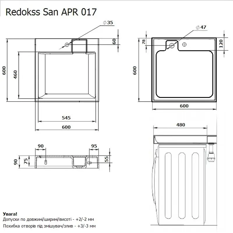 Умивальник Redokss San DEYMOS 60х60х9 см — для встановлення над пральною машиною завглибшки до 48см.Умивальник з литого армованого акрилу Redokss San — надійне рішення для встановлення над пральною машиною. Міцний матеріал, зручна форма та сучасний дизайн забезпечують комфортне використання у компактному просторі. Широкий вибір моделей під будь-який розмір пральної машини.Переваги: - Мала вага - до 5 кг;- Зберігає колір весь час експлуатації; - Водонепроникний матеріал; - Екологічно чистий; - Легко чиститься, стійкий до зношування навіть у разі використання поза приміщенням;- Простий монтаж.Характеристики:Матеріал: Акрил високої якостіКолір: БілийГабарити:Довжина: 60см.Глибина: 60см.Висота: 9см.(глибока чаша)Комплект містить: сифон, монтажні кріплення.Колір може будь-яким із палітри RAL — під замовлення.