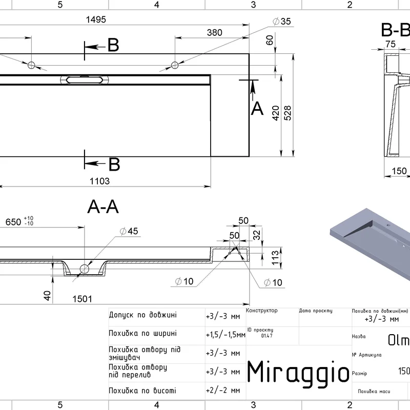 Умивальник OLMOS 1500 MIRASOFT Miraggio