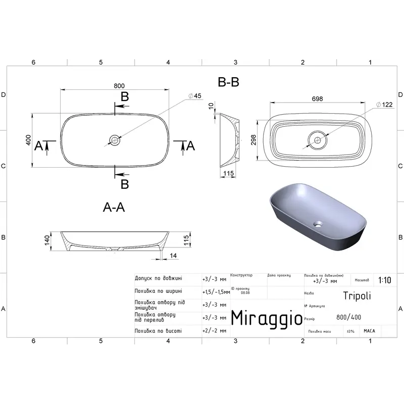 Умивальник TRIPOLI MATT MIRAGGIO зі штучного каменю - це практичне рішення для санвузла дому, готелю чи дачі.