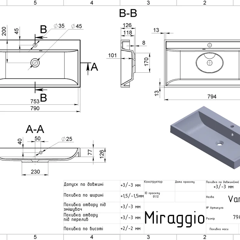 Умивальник VARNA 800 MIRASTONE GRAY Miraggio
