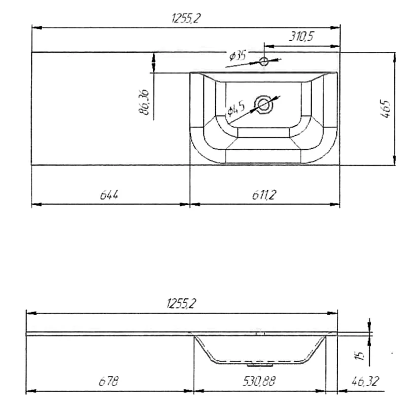 - Чаша має єдиний вигляд із полотном стільниці глибиною 140 мм