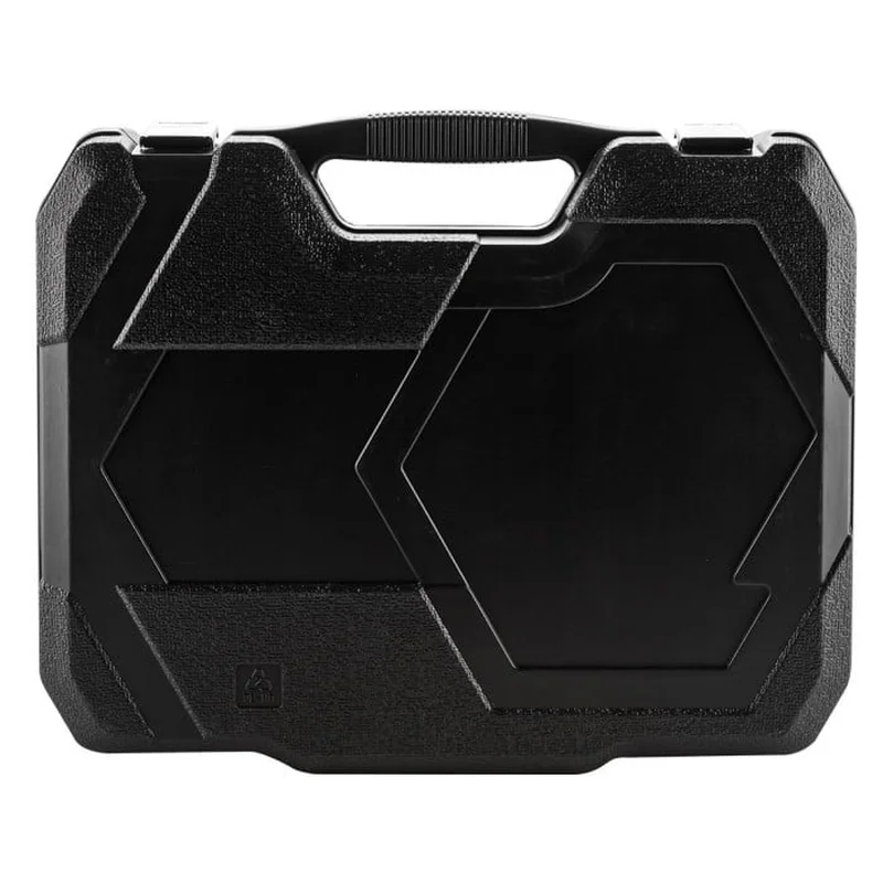 Комплектация: шестигранні ключі (9 шт.), подовжувачі (2 шт.), наконечники для викрутки, шарнірно-губцевий інструмент, викрутки (6 шт.), ріжково-накидні ключі, комір, тріскачка, перехідник, шарнір, кейс, молоток, комбіновані ключі, прецизійні викрутки, затискачі, ніж з лезом, що ламається, розвідний трубний ключ, універсальні плоскогубці