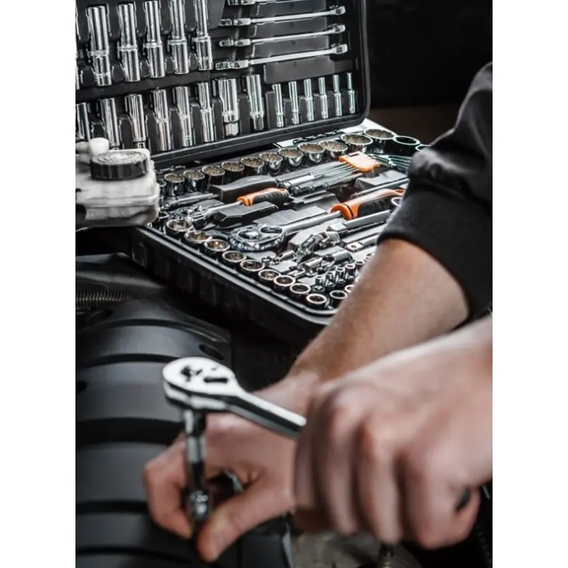 Комплектация: Дванадцятигранні головки 1/2" 17 шт.: 10, 11, 12, 13, 14, 15, 16, 17, 18, 19, 20, 21, 22, 24, 27, 30, 32 мм;Головки довгі шестигранні 1/2" 6 шт.: 10, 12, 13, 14, 17, 19 мм;Тріскання 1/2",72 зубців;Універсальний подовжувач 1/2";Універсальні подовжувачі 1/2" 2 шт.: 125 мм та 250 мм;Вороток Т-подібний1/2";Головки Torx 1/2" 3 шт.: E20, E22, E24;Шестигранні головки 3/8" 11 шт.: 9, 10, 11, 12, 13, 14, 15, 16, 17, 18, 19 мм;Головки довгі шестигранні 3/8" 6 шт.: 10, 11, 12, 13, 14, 15 мм;Тріскачка 3/8", 72 зубців;Головки Torx 3/8" 6 шт.: E10, E11, E12, E14, E16, E18;Універсальний подовжувач 3/8";Подовжувачі 3/8" 2 шт.: 75 мм та 15 0 мм;Свічкові головки 3/8" 2 шт.: 16 мм та 21 мм;Головки 3/8" 3 шт.: PH1, PH2, PH3;Головки 3/8" 5 шт: T30, T40, T45, T50, T55;Головки 3/8" 6 шт.: H3, H4, H5, H6, H8, H10;Головки 3/8" 3 шт: PZ1, PZ2, PZ3;Головки 3/8" 3 шт.: SL4, SL5.5, SL6.5;Шестигранні головки 1/4" 13 шт.: 4, 4.5, 5, 5.5, 6, 7, 8, 9, 10, 11, 12, 13, 14 мм;Головки довгі шестигранні 1/4" 6 шт.: 4, 5, 6, 7, 8, 9 мм;Головки Torx 1/4" 5 шт.: E4, E5, E6, E7, E8;Тріскання 1/4";Універсальний подовжувач 1/4";Подовжувачі 1/4" 2 шт.: 50 мм та 100 мм;Вороток Т-подібний 1/4";Перехідник 1/4";Наконечники 10 шт.T10H, T15H, T20H, T25H, T27H, T30H, T40H;ST20, ST25, ST30;Шестигранні ключі 9 шт.: 1.5, 2, 2.5, 3, 4, 5, 6, 8, 10 мм;Кейс