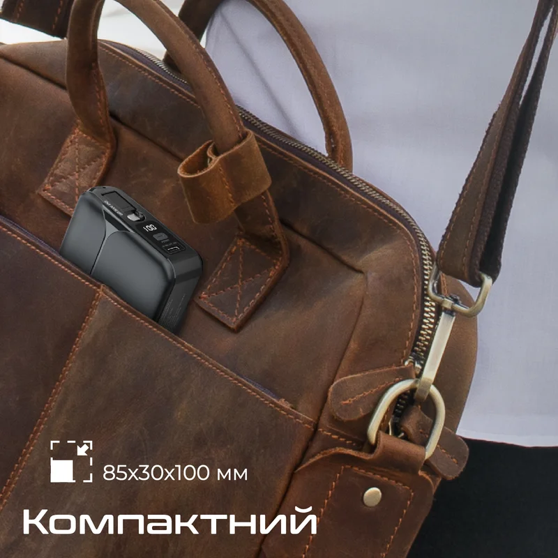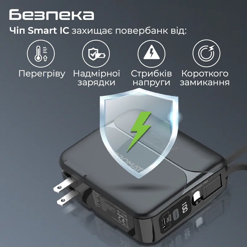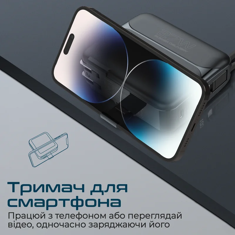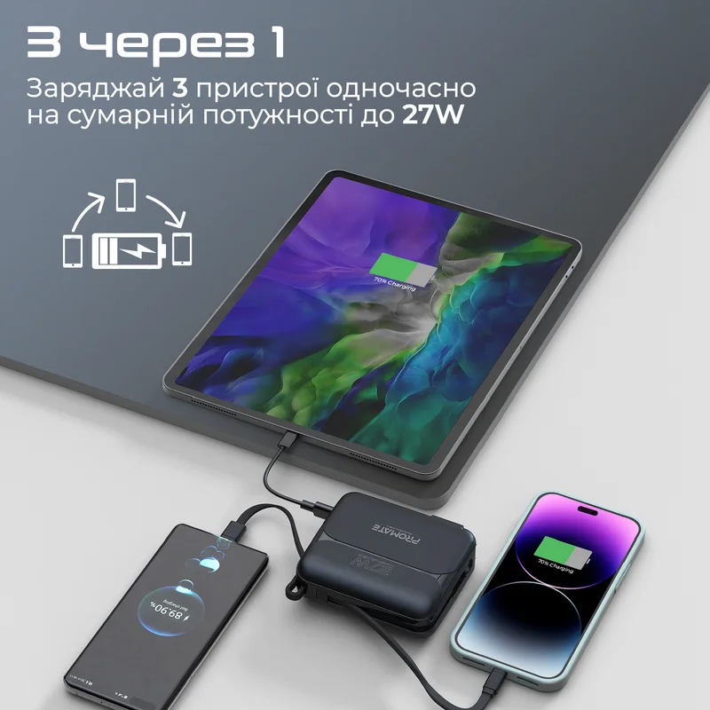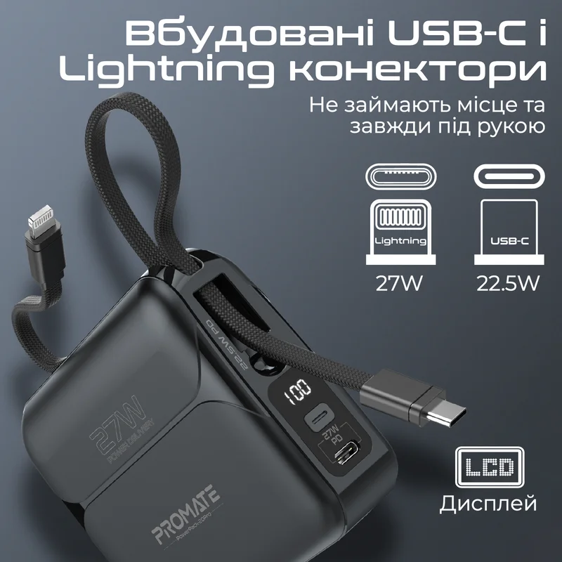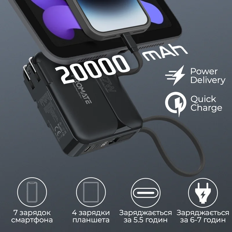 PowerPack-20Pro - вдосконалений варіант популярної моделі повербанку PowerPack-PD20 від Promate. Потужність USB-C порту та вбудованого Lightning кабелю збільшена до 27W, що дозволить заряджати девайси ще швидше. Особливості: Li-Pol батарея на 20 000 mAh: Підзарядить смартфон до 7 разів або планшет до 4 разів. Сам повербанк можна зарядити через USB-C порт за 5.5 годин або від мережі за 6-7 годин. 3 через 1: Заряджай 3 пристрої одночасно на сумарній потужності до 27 W. 27W USB-C порт: З підтримкою технології Power Delivery, зарядить акумулятор ємністю 3700 mAh всього за 1 годину. Працює у двох режимах: 5V/2.4А, 9V/3А. 22.5W USB-C Power Delivery кабель: Блискавична швидкість зарядки смартфона або планшета. Працює у чотирьох режимах: 4.5V/5А, 5V/2.4А, 9V/2А, 12V/1.5А. 27W Lightning конектор: Забезпечить максимальну на сьогоднішній день швидкість зарядки iPhone (50% за 30 хвилин). Зарядка від мережі: Просто надягни необхідний штекер і підключайся до будь-якої розетки. У комплекті є адаптери для EU/US/UK стандартів. Безпека: Вбудований чіп Smart IC захищає повербанк та підключені до нього пристрої від перегріву, стрибків напруги, короткого замикання та надмірної зарядки. LED дисплей: Відображає рівень заряду у відсотках із точністю до одиниці. Створений для подорожей: Компактний розмір (85х30х100 мм), вбудовані кабелі та набір мультиштекерів для зарядки в будь-якій країні світу. Тримач для смартфона: Забезпечить комфортний кут нахилу. Продовжуй працювати з телефоном або переглядай відео, одночасно заряджаючи його.
