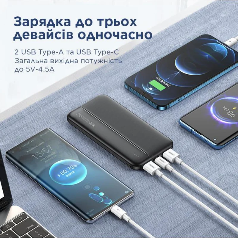 УМБ Remax Tinyl Series 10000 мАг - це сучасний пристрій для швидкої та безпечної зарядки електроніки. Він працює з усіма сучасними протоколами, включаючи Power Delivery 20Вт та Quick Charge 22.5Вт. На бічній частині розташований дисплей для відстеження заряду батареї. Для перевірки рівня заряду батареї необхідно натиснути кнопку на торці Power Bank. Power Bank має кілька портів, що забезпечує зручне використання: Вхідний порт Micro-USB (18W) Вхідний/Вихідний порт Type-C (18W/20W) Вихідний порт USB Type-A (22.5W) Вихідний порт USB Type-A (22.5W) В УМБ Remax використовуються полімерні батареї – безпечні та надійні. Їх використання дозволено на літаках і високошвидкісних поїздах. Особливості: Приємний на дотик з мінімальним дизайном Виготовлений із високоякісного вогнестійкого пластику. Підтримує протоколи PD 20Вт та QC 22.5Вт
