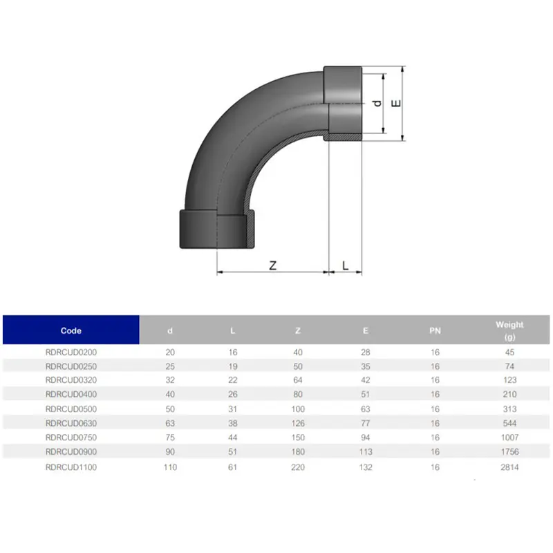 Плавний відвід на 90° градусів ПВХ Effast RDRCUD з непластифікованого полівінілхлориду PVC-U. Виробництво Італія. Вироби з ПВХ підходять для транспортування рідин з максимальною температурою до 60°C. При збільшенні температури робочої рідини граничний тиск знижується. Ціна вказана за одну одиницю.