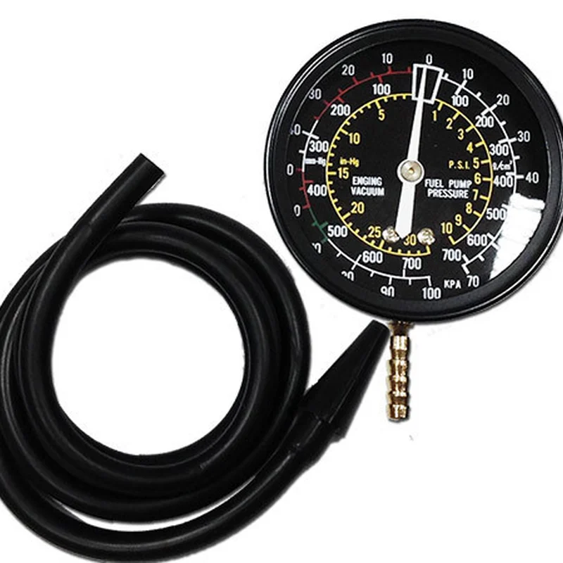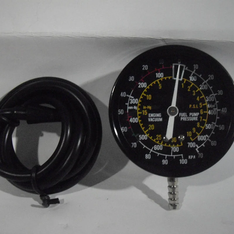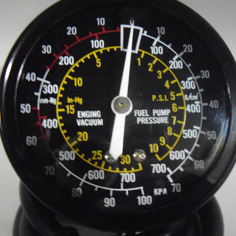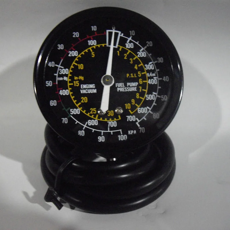 Вакууметр TRISCO G-310 застосовується для регулювання карбюратора, вимірювання тиску турбонаддува, тестування на зношеність або несправність компоненти паливних насосів. Використовується для виявлення таких несправностей:перебої в роботі свічок запалюваннянизька ступінь стиснення в двигунізбідненість або збагаченість паливної сумішівипередження або відставання запалюванняпідсос повітря через карбюратор і впускний колекторпорушення фаз газорозподілунадмірна витрата палива Характеристики:Манометр діаметром 2,5"Довгий, гнучкий і міцний гумовий шланг з наконечником притискнимДіапазон досліджуваного тиску: 0-10 psi (0-0.7 кг/см2)Діапазон досліджуваного вакууму: 0-30 psi (0-760 мм рт.ст.)