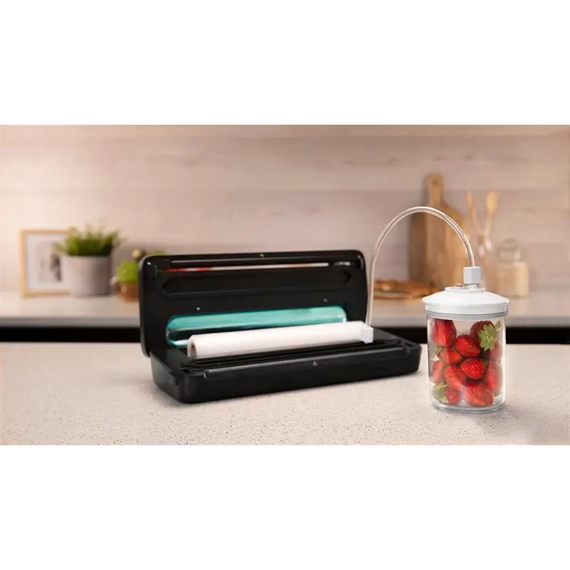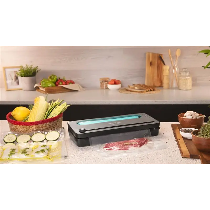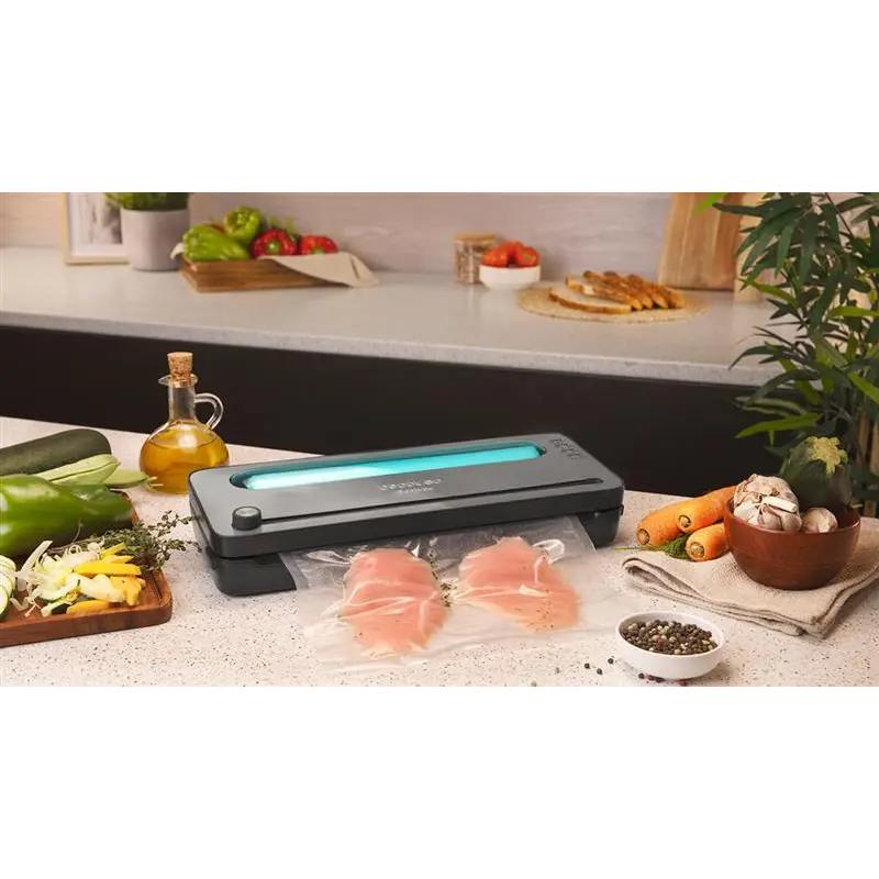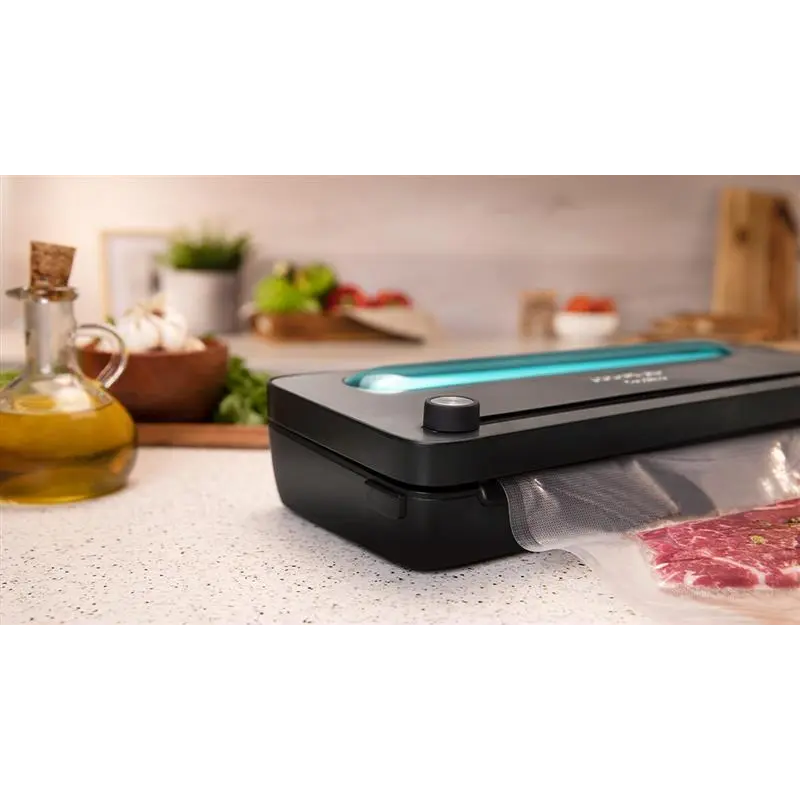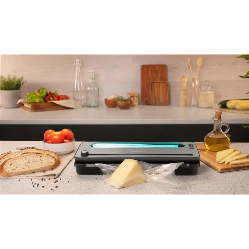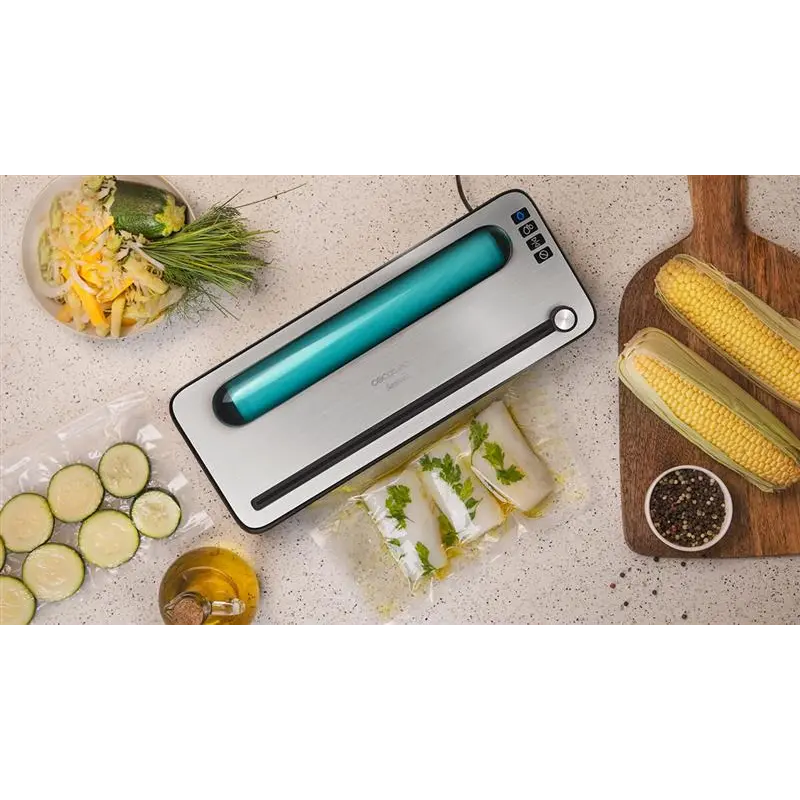 Вакуумний пакувальник SealVac 120 SteelCut спорожняєте і запечатує, що дозволяє довше зберігати продукти свіжими. Він забезпечує найкраще ущільнення завдяки високому вакуумному тиску 0,75 бар і високій швидкості всмоктування. Крім того, він спрощує вам задачу завдяки своєму діспенсерному відсіку для рулону, вбудованому складному ножу і режимам роботи. Це дозволяє дуже просто зберігати продукти свіжими довше. СВІЖІ ПРОДУКТИ ТРИВАЛИЙ ЧАС. Упаковуйте будь-які продукти легко і швидко з вакуумною машинкою CECOTEC SealVac 120 SteelCut. Вона має відмінну швидкість роботи, вбудований ніж і диспенсерний резервуар для пакувального матеріалу. Високий тиск 0,75 бар дає змогу більш щільно спаювати пакет і надійно зберігати свіжість їжі. ПОТУЖНІСТЬ 120 ВТ. Продукти у вакуумній упаковці в 5 разів довше зберігають свіжість і корисні компоненти. Для прихильників здорового харчування це незамінний спосіб зберігання їжі. З потужністю 120 Вт процес їх підготовки до заморожування займе мінімум часу, а результат приємно здивує вас. ВИСОКА ШВИДКІСТЬ РОБОТИ. Немає можливості витрачати багато часу на заготовки? З вакуумним пакувальником вам буде потрібно всього 10 секунд для вакуумування продуктів. Сьогодні ви витрачаєте кілька хвилин на пакування їжі, а завтра ваш раціон складатиметься виключно зі свіжих і збагачених вітамінами страв. ВБУДОВАНИЙ НІЖ І РУЛОН ПАКЕТІВ Підбирайте розмір пакета під форму і розміри ваших продуктів. Рулон пакетів не розділений на стандартні розміри, ви можете відрізати їх вбудованим ножем. Таким чином ви заощадите упаковку для подальшого використання. ЗБЕРІГАЙТЕ ПРОДУКТИ ДОВШЕ. Усього одне натискання кнопки допоможе витягнути повітря з пакета. У ньому не залишиться зайвого кисню і продукти зберігатимуться довше. Вакуумний тиск 0,75 бар забезпечує ідеальну герметичність і компактність упакованого продукту. УПАКОВКА АДАПТУЄТЬСЯ ДО БУДЬ-ЯКОЇ ЇЖІ. Обирайте сухий або вологий тип вакуумування, щоб надійно зберігати будь-які продукти. Пакувальник SealVac 120 SteelCut впорається з цими завданнями однаково успішно. ПОВНИЙ ВАКУУМ. З функцією абсолютного вакууму упакована їжа ущільнюється. Це відбувається завдяки натисканню однієї кнопки. Герметичний пакет займе ще менше місця у вашій морозильній камері. ВАКУУМУВАННЯ БАНОК. Унікальна функція вакуумування в банці допоможе вам створювати безліч маринованих закусок або консервованих фруктів. У такій упаковці не порушується цілісність м'яких продуктів. ШИРОКИЙ ФОРМАТ І ПРОФЕСІЙНА РОБОТА. Ширина нагрівальної стрічки становить 31 см. Такий розмір дає змогу упаковувати одразу кілька продуктів. Заощаджуйте час, обирайте необхідний розмір пакета та отримуйте професійне пакування.