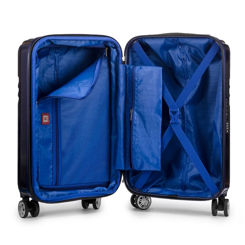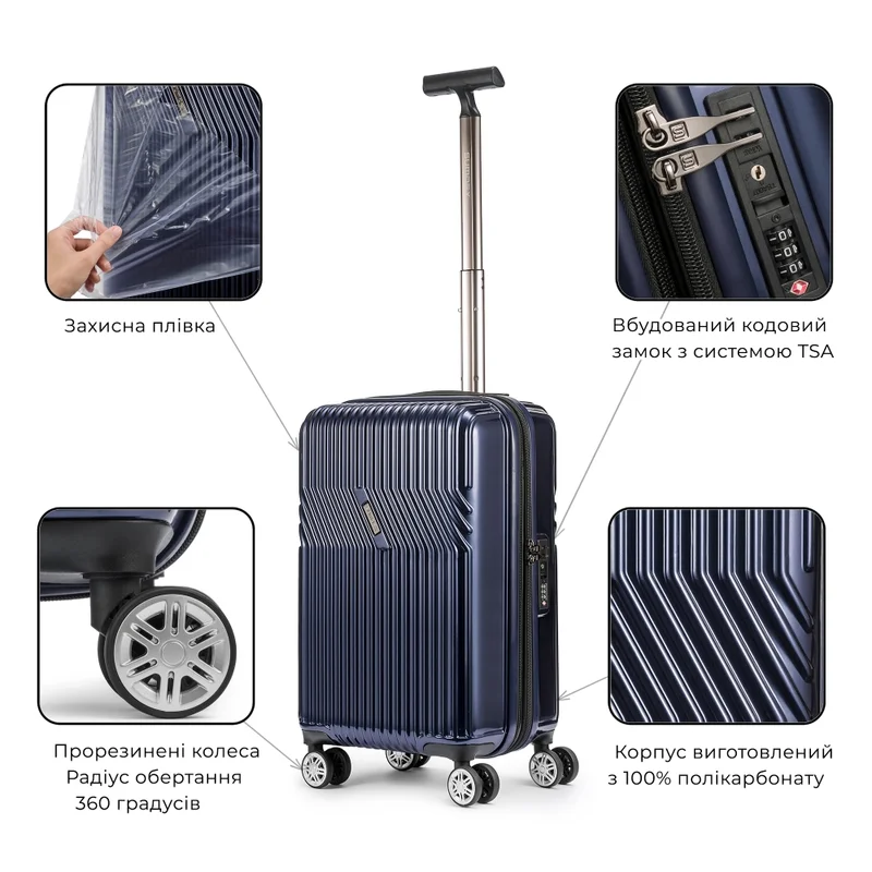 Корпус валізи виготовлений зі 100% полікарбонату, що робить його ударостійким і довговічним; Дизайн ручок і кодового замка валізи виконаний в максимально прихованому стилі, для запобігання пошкодження їх під час транспортування, в різних видах транспорту. Всередині: 2 відділення: одне з фіксуючими ременями для одягу, друге закривається текстильною перегородкою на блискавку; 1 кишеня на блискавці (сітка); Зовні: Висувна ручка з кнопковим фіксатором; Зверху розташована переносна ручка; Міцна і витривала 4-х колісна система подвійних коліс з радіусом обертання 360 градусів дозволяє переміщати багаж, не докладаючи зусиль; Вбудований кодовий замок з системою TSA.
