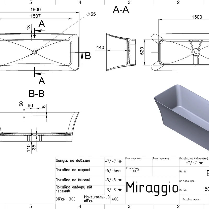 Ванна BONITA зі штучного каменю може бути пофарбована в будь-який колір за палітрою RAL. Зверніть увагу, забарвлюється тільки зовнішня поверхня виробу. Ванни з матеріалу MIRASOFT, фарбуванню не підлягають. Всі моделі ванн MIRAGGIO комплектуються сифонами фінського виробництва і мають гарантію від виробника 10 років.