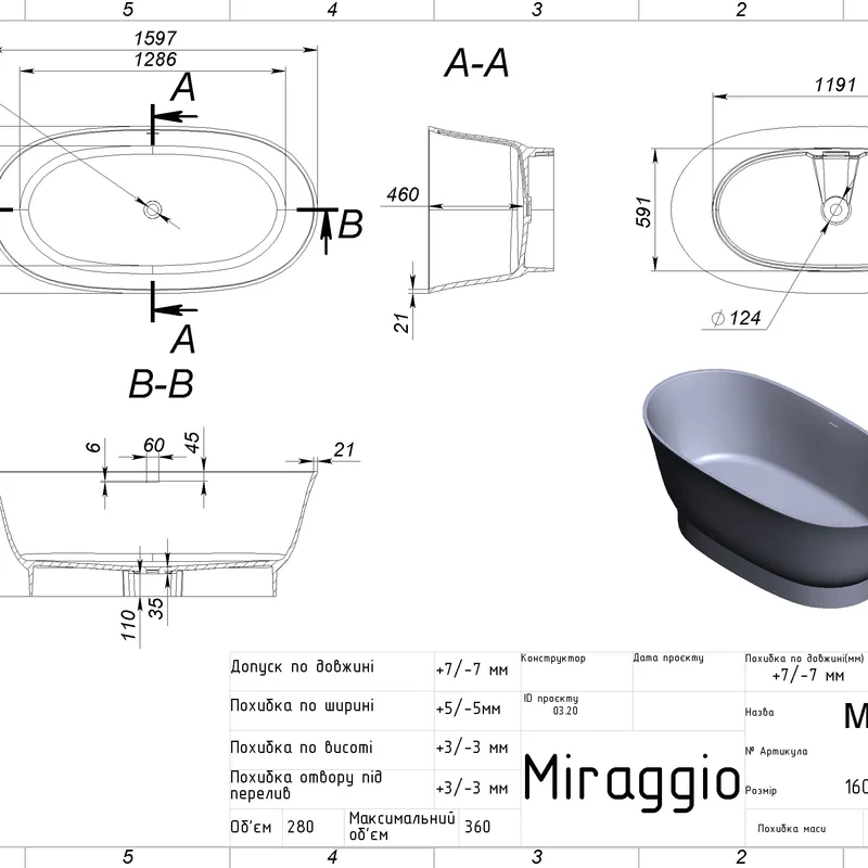 Ванна MOLLY MIRASOFT зі штучного каменю може бути пофарбована в будь-який колір за палітрою RAL. Зверніть увагу, забарвлюється тільки зовнішня поверхня виробу. Ванни з матеріалу MIRASOFT, фарбуванню не підлягають. Всі моделі ванн MIRAGGIO комплектуються сифонами фінського виробництва і мають гарантію від виробника 10 років.