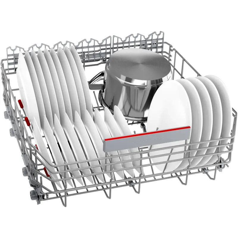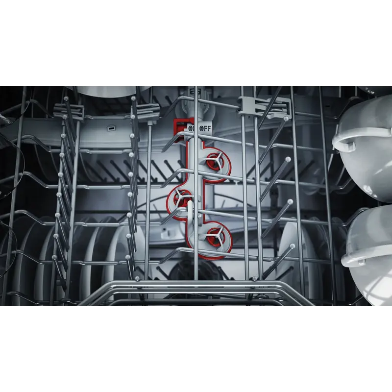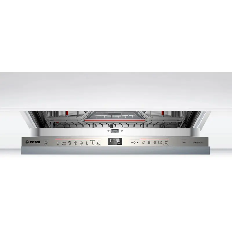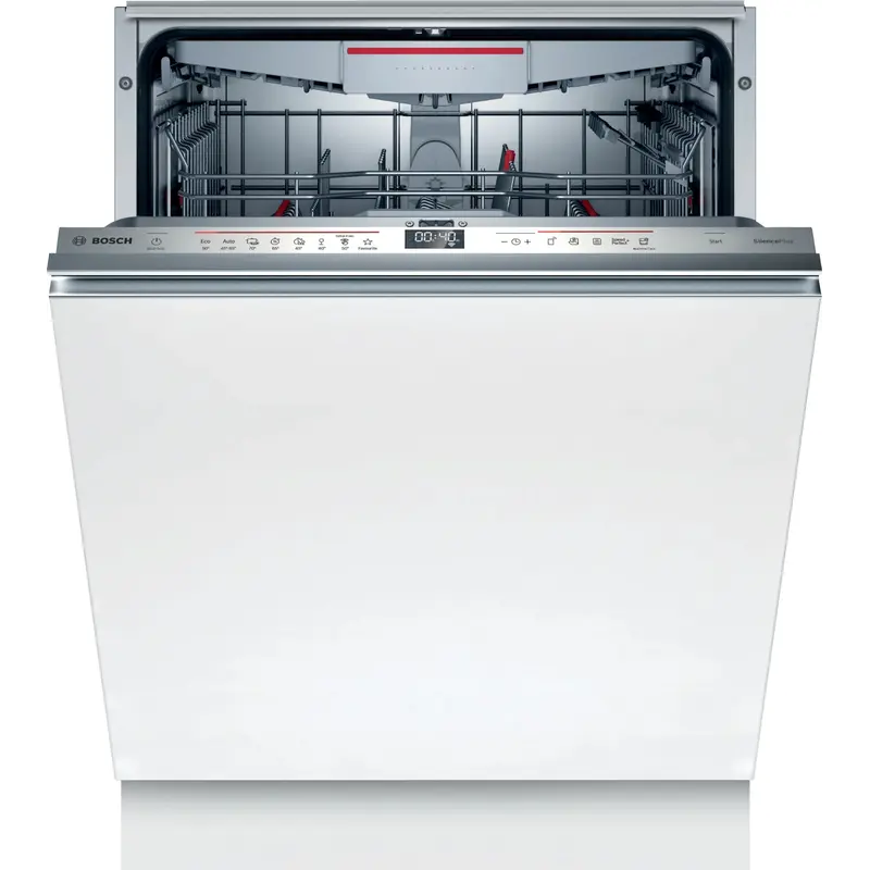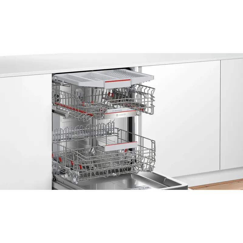 Вбудована посудомийна машина Bosch SMV6ECX50K шириною 60 см розрахована на 13 комплектів посуду. Девайс оснащений 8 програмами: "Інтенсивна 70 °C", "Автоматична 45-65 °C", "Економічна 50 °C", "Тиха 50 °C", "1год 65 °C", "Скло 40 °C", "Швидка 45 °C ", "Улюблена" і 4 спеціальними функціями: Remote Start, VarioSpeed ??Plus, HygienePlus, ExtraDry. Рівень шуму програми "Тиха 50 °C": 41 дБ, а клас енергоефективності - A+++.