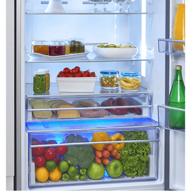 Сучасний холодильник від компанії beko, з технологією NeoFrost. Технологія MinFrost. Технологія, яка зменшує обмерзання. Через намерзання льоду продукти в холодильнику злипаються, а пристрій споживає більше електроенергії. Спеціальна система випаровування MinFrost мінімізує обмерзання всередині холодильника. Це означає, що заморожені продукти зберігатимуться довше, споживатиметься менше електроенергії, а розморожувати холодильник знадобиться рідше. Полиці з високоміцного скла. Не хвилюйтеся, ставлячи велику важку каструлю в холодильник із полицями з безпечного скла. Вони виконані із загартованого високоміцного скла і витримують навантаження до 25 кг. Ці полиці більшою мірою стійкі до появи тріщин і подряпин, ніж полиці з необробленого скла, тому ви можете без побоювань ставити на них важкий посуд. LED підсвічування. Яскраве світлодіодне підсвічування гарантує якісне та ефективне освітлення холодильної камери.