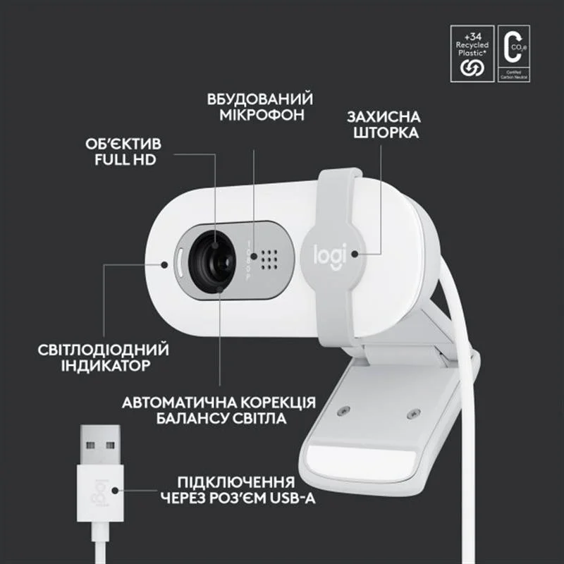 Веб-камера BRIO 100 Full HD 1080p з автоматичним балансом освітленості, вбудованою захисною шторкою і вбудованим мікрофоном. Дивіться краще, чіткіше Роздільна здатність Full HD 1080p забезпечує кращу чіткість зображення для більш комфортних розмов. Виглядайте на 50% яскравіше Функція RightLight збільшує яскравість на 50%, зменшуючи тіні, що дає змогу виглядати краще, ніж веб-камери Logitech попереднього покоління. Веб-камера Brio 100 тестувалася в порівнянні з веб-камерою Logitech C270 компанією Logitech. Тестування проводили в контрольованих умовах, і протягом дня середньозважене поліпшення яскравості обличчя користувача становило 50%. Результати можуть відрізнятися залежно від реальних умов освітлення. Повна конфіденційність Вбудована шторка, продумана з урахуванням особливостей роботи та дому, забезпечує надійний захист від сторонніх очей. Коли робочий день закінчено, засуньте шторку, щоб знайти душевний спокій. Звучіть краще Зручний вбудований мікрофон забезпечує чітку чутність під час відеодзвінків, що дає змогу виглядати та звучати якнайкраще без зайвої метушні. Підключи та працюй на своїй платформі Brio 100 сумісний із більшістю платформ для відеозв'язку, як-от Microsoft Teams, Google Meet і Zoom, а також із більшістю операційних систем, як-от Windows, macOS і ChromeOS. Сучасні, вишукані колірні рішення Привабливий дизайн у вишуканих кольорах дає змогу координувати роботу з обладнанням і проявляти свою індивідуальність на роботі. Налаштування за допомогою програми Logi Options+ Простий у використанні застосунок дає змогу налаштовувати візуальні параметри, щоб мати найкращий вигляд під час відеодзвінків.