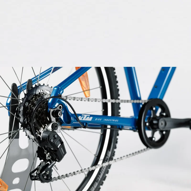 Трансмиссия на 7 скоростей собрана на базе заднего переключателя Shimano RD-TY200-SS, трещотки Shimano MF-TZ510-7 и шифтеров SL-RV200-7R. Переключатель идеально подходит для подросткового байка, так как обеспечивает качественное и точное переключение даже в сложных погодных условиях. Корпус изготовлен из алюминиевого сплава, а рамка из прочной стали, настройка ведется с помощью двух болтов. Эргономичные шифтеры имеют функцию индексного переключения с легким поворотом запястья. Муфта свободного хода имеет более высокую устойчивость к коррозии в отличие от предыдущих версий, обеспечивая надежное переключение в разных погодных условиях. Повышать и понижать передачи возможно сразу на несколько уровней, а узнать, на какой передаче система можно лишь взглянув на указатель.