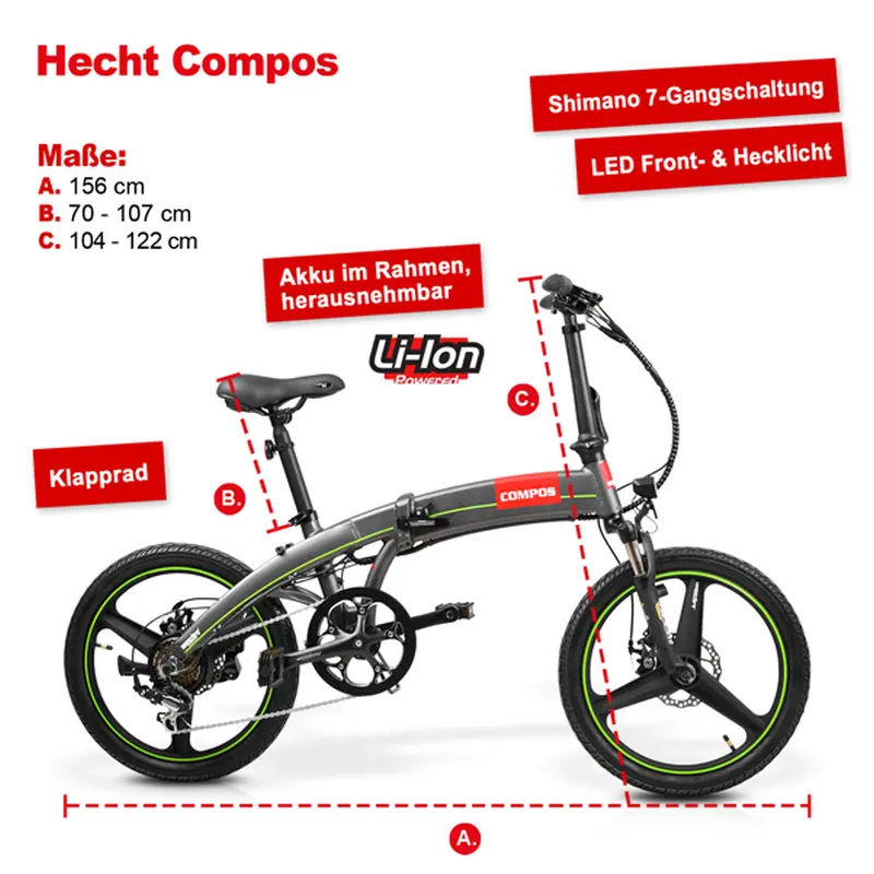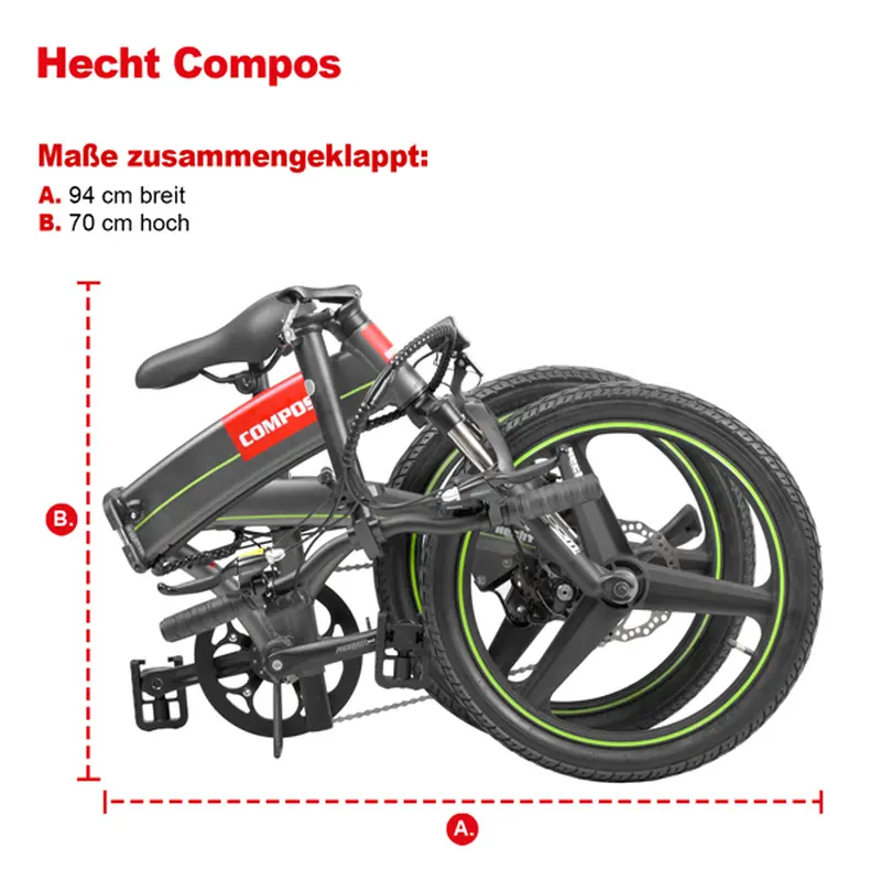 Електричний складаний велосипед Compos від Hecht тепер доступний для будь-якої відпустки та екскурсії. У невеликому складеному вигляді він займає мало місця в багажнику або каравані і відразу готовий до використання. Складаний велосипед також є практичним рішенням для пасажирів автобусів і потягів.
