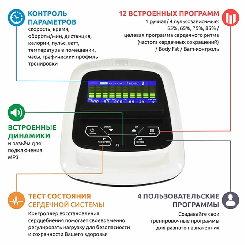 - Программный модуль имеет 12 встроенных программ, в т.ч. 1 ручную, 4 пульсозависимые: 55%, 65%, 75%, 85%; 4 пользовательские, целевую программу сердечного ритма (частота сердечных сокращений); Body Fat; Ватт-контроль;