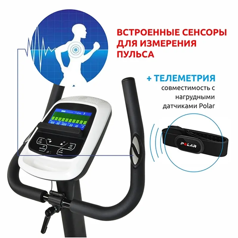 - Сенсорные датчики измерения пульса расположены на эргономичных рукоятках + телеметрия (совместимость с нагрудными датчиками Polar). Внутренняя цифровая система измерения пульса имеет высокую помехоустойчивость;