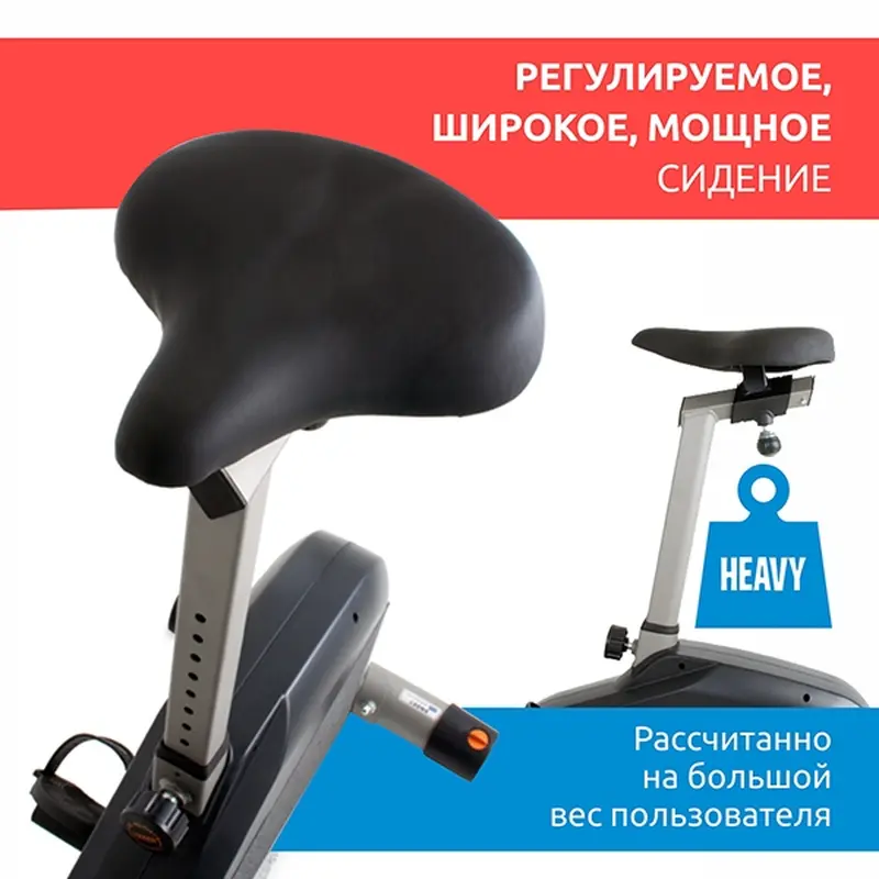 - Большое полиуретановое сидение анатомической формы позволяет проводить длительные тренировки с комфортом, а регулировки по вертикали и горизонтали делают велотренажер универсальным для всех членов семьи;