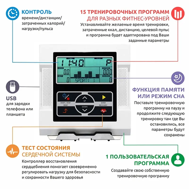 - 4 пользовательских профиля, 16 уровней сопротивления и 15 тренировочных программ порадуют как начинающих так и опытных пользователей, позволяя отслеживать свои результаты и достичь максимального эффекта от тренировок с учетом разных фитнес-уровней;
