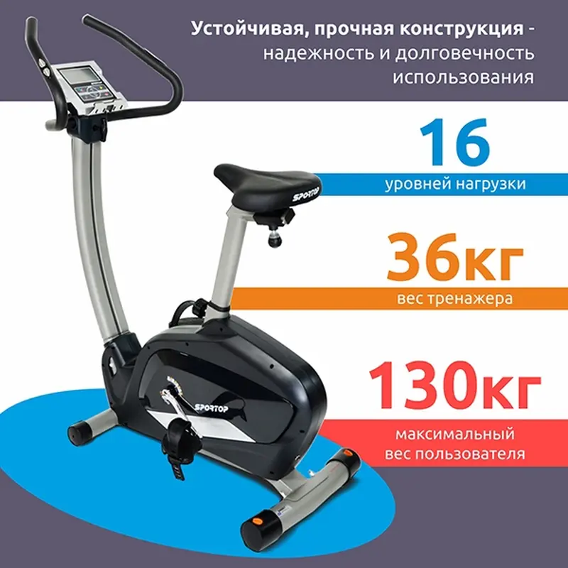 Велотренажер Sportop B800P+ - базовая модель в линейке велотренажеров Sportop, стильная и надёжная, сразу стала бестселлером продаж в своей ценовой категории! Качественный тренажер для дома для тех, кто обращает внимание на динамичный дизайн, вес тренажера, стабильность конструкции, удобство и комфорт во время тренировок.