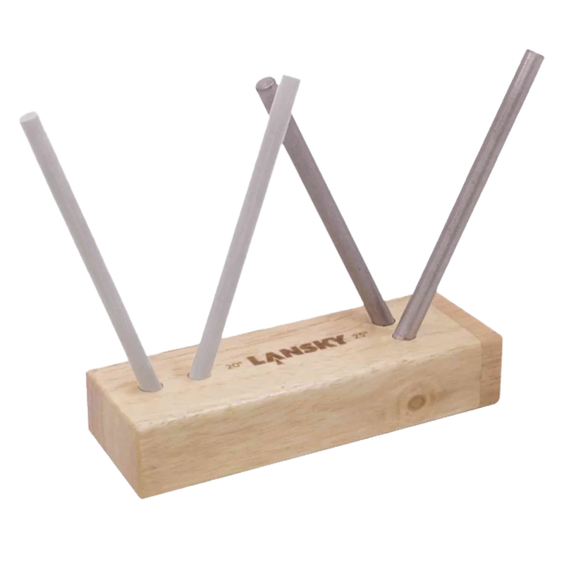Одна або декілька пар отворів свердлити в дерев'яному бруску під різними кутами відносно один одного. Після цього пара точильних каменів може бути встановлена у відповідну пару отворів – і можна здійснювати заточку! Після закінчення роботи точильні камені можуть бути прибрані – брусок-основа має відсік для зберігання точильних каменів.