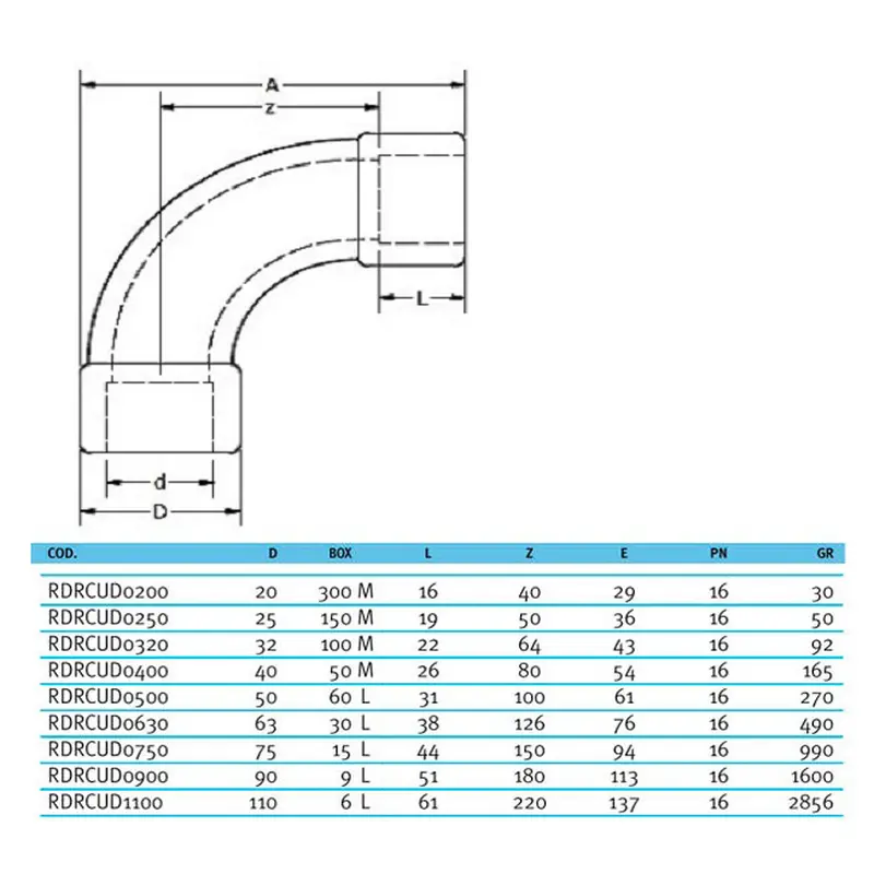 Плавний відвід на 90° градусів ПВХ Effast RDRCUD з непластифікованого полівінілхлориду PVC-U. Виробництво Італія. Вироби з ПВХ підходять для транспортування рідин з максимальною температурою до 60 °C. При збільшенні температури робочої рідини граничний тиск знижується. Ціна вказана за 1 штуку.