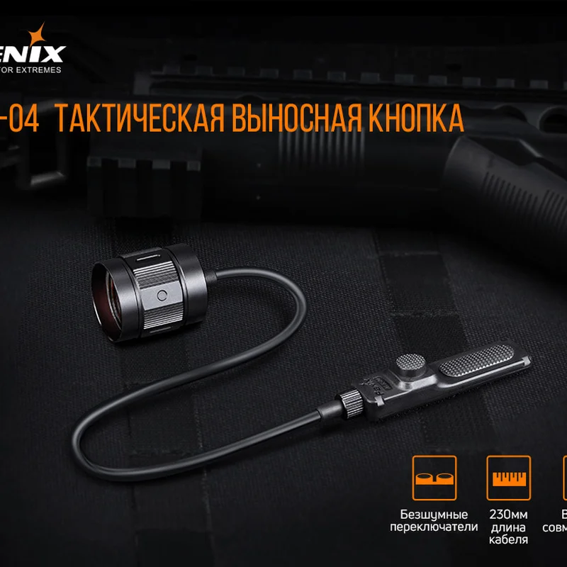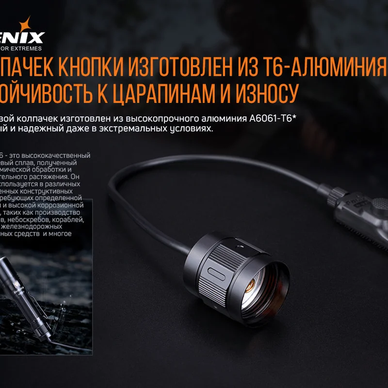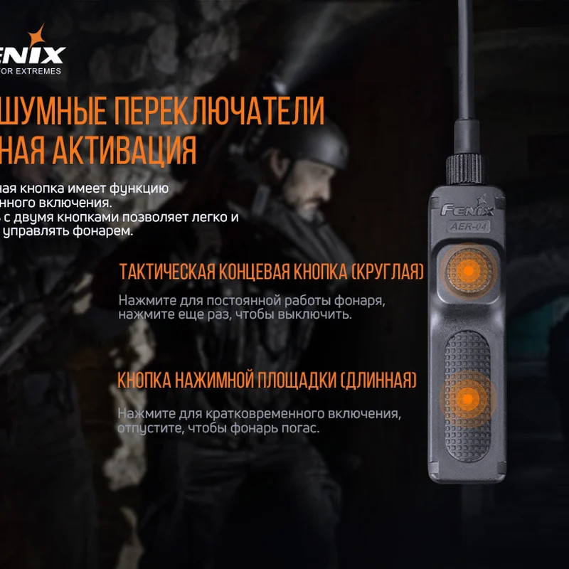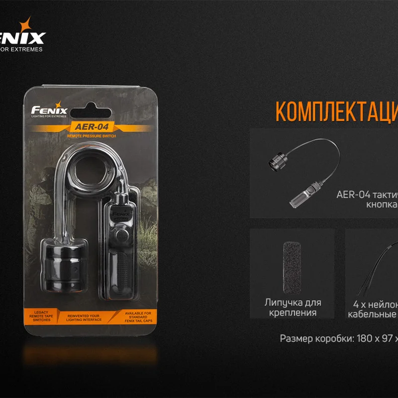 Кнопка Fenix AER-04 стане в пригоді тим, хто займається полюванням, виконує спецзавдання, військові операції, також матиме користь гравцям в страйкбол. Аксесуар служить для використання спільно з тактичними ліхтарями, які працюють на батареї 21700, наприклад HT18 та іншими моделями. Кнопка дає можливість вивести на якусь відстань механізм управління ліхтарем, таким чином стаючи дистанційним перемикачем. Що дуже зручно при виконання тактичного завдання.