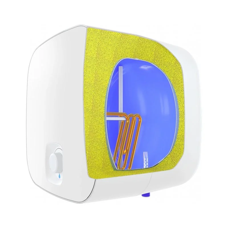 - Модель водонагрівача оснащена індикатором рівня нагріву та готовності обладнання. Управління здійснюється механічним способом. Корпус має правильну прямокутну форму з нижнім підведенням труби.