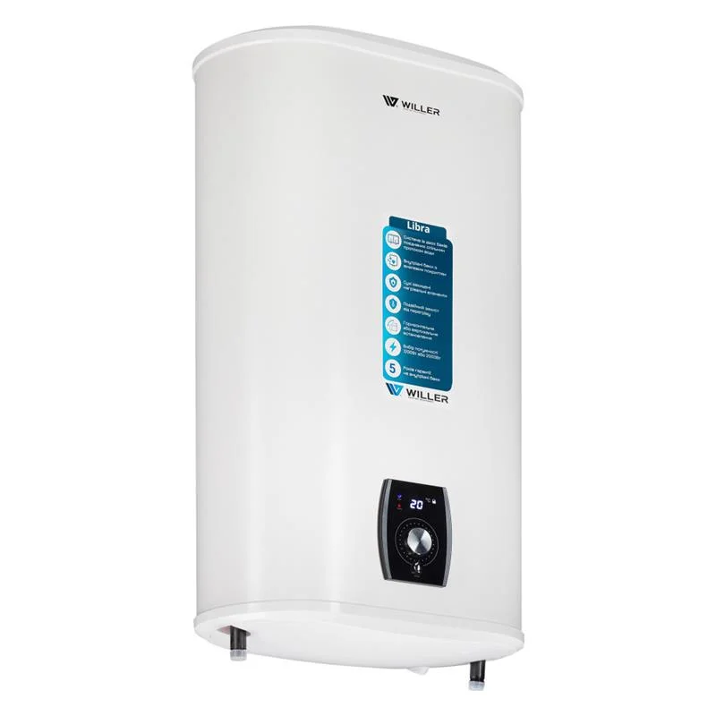 Особливості бойлерів Willer серії Libra: Сучасна електронна панель управління водонагрівачем із вбудованим LED-дисплеєм для відображення температури. Два сухих ТЕНа потужністю 2000 Вт швидко забезпечать вас гарячою водою. Індикація підключення до електромережі, стану нагріву та вибраної потужності. Можливість вибору користувачем потужності 1200 Вт або 2000 Вт однією кнопкою. Високоякісна титанокварцова емаль забезпечує захист внутрішніх баків від корозії. Додатково захист посилено двома захисними магнієвими анодами, що встановлені в кожному баку. Нагрівальні елементи розташовані в спеціальних захисних кожухах (фланцях) і безпосередньо не контактують з водою, що продовжує строк служби водонагрівача Захист від надлишкового тиску, подвійний захист від перегріву води (терморегулятор + термозапобіжник) для безпечного користування. Універсальне розташування водонагрівача: горизонтально або вертикально.