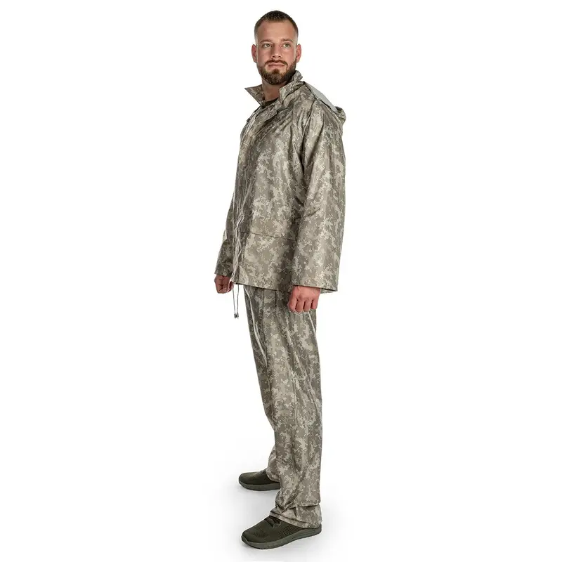 Легкий и прочный плащ-комплект из двух частей в камуфляже AT-Digital, состоящий из штанов и куртки с капюшоном, спрятанным в воротник. Идеально подходит как внешний защитный слой от неблагоприятных погодных условий. Набор изготовлен из полиэстера с ПВХ покрытием. Куртка с капюшоном застегивается на молнию, которая закрепляется клапаном на кнопках, имеет 2 больших кармана и вентиляционные отверстия. Брюки с эластичным поясом имеют два открытых кармана на бедрах, а ширина штанин регулируется кнопками. Шнурок на уровне талии предотвращает проникновение ветра под куртку. Все это можно легко сложить и упаковать в обложку, которая прилагается к набору. Технические характеристики Камуфляж: AT-Digital Материал: 100% полиэстер (покрытие ПВХ) Водонепроницаемость: 3000 мм Вес: 200 г