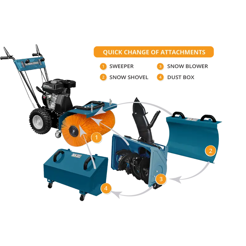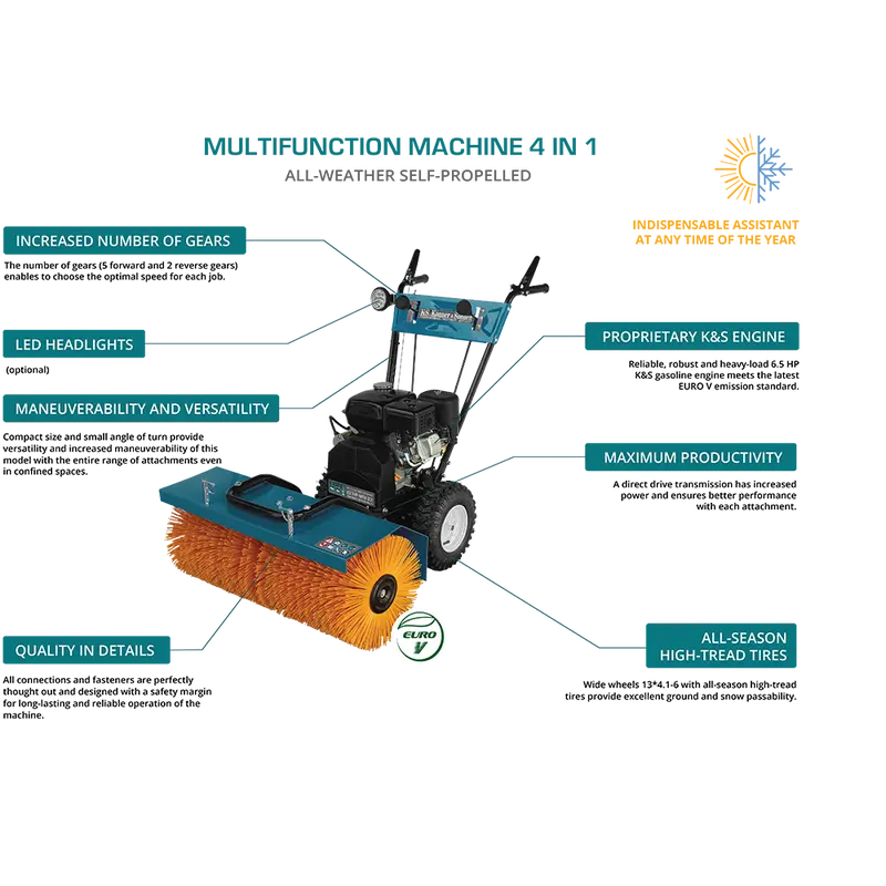 Насадка для багатофункціональної машини Könner & Söhnen, яку можна використовувати цілий рік. Вона швидко і ефективно впорається з пилом, брудом, опалим листям і сніговими заметами. Це незамінний помічник у підтримці бездоганної чистоти у дворі, на під’їздах до будинків і гаражів, а також на пішохідних доріжках в парках, скверах та інших прилеглих територіях.