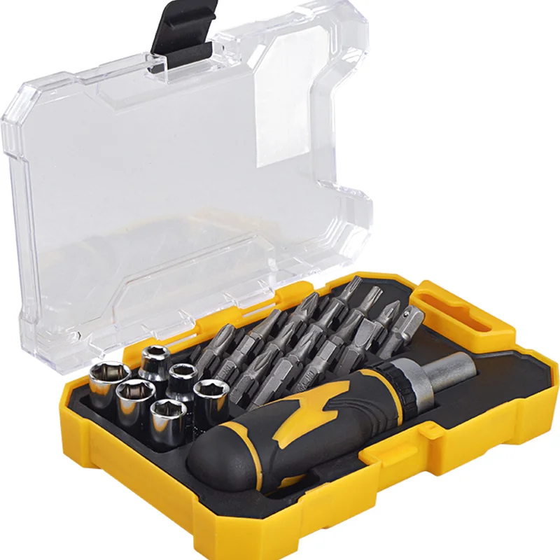 Викрутка зі змінними бітами і голівками. Кількість в наборі — 23 шт. Типорозміри насадок: SL(3.0, 4.0, 5.0, 6.0); PH(0-3); T(15, 20); HEX(4.0, 5.0, 6.0 мм); PZ(1, 2); головки(5-10 мм) Реверсивна викрутка дозволяє: 1) Жорстко зафіксувати стрижень при робочому русі - відкручування або закручуванні. 2) Вільно обертатися стрижня при зворотному русі. Таким чином, робота здійснюється тільки пензлем, що менше втомлює, більш ефективно і травмобезпечний. Композитна рукоятка має ергономічну форму для комфортної роботи. Профіль рукоятки забезпечує щільний контакт викрутки з рукою, запобігаючи падінню. Кількість насадок 23 шт Рукоятка 1 шт Упаковка Пластиковий кейс Тип/розмір SL(3.0, 4.0, 5.0, 6.0); PH(0-3); T(15, 20); HEX(4.0, 5.0, 6.0 мм); PZ(1, 2); головки(5-10 мм)