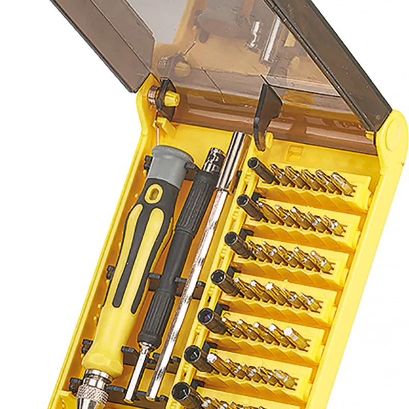 Набір викруток з профілями «шліц» SL, «хрест» PH, «зірочка» Torx, шестигранний, призначений для прецизійних ремонтних робіт виробів з малими гвинтовими з'єднаннями і включає викрутку зі змінними прецизійними бітами і двома подовжувачами, один з яких гнучкий. Виконаний із хром-ванадієвої сталі. Тип / Розмір Шліцьова SL 1,0 мм х 1 шт Шліцьова SL 1,5 мм х 1 шт Шліцьова SL 2,0 мм х 1 шт Шліцьова SL 2,5 мм х 1 шт Шліцьова SL 3,5 мм x 1 шт Хрестоподібна PH000 х 1 шт Хрестоподібна PH00 х 1 шт Хрестоподібна PH0 х 1 шт Хрестоподібна PH1 x 1 шт Хрестоподібна PH2 x 1 шт Зірочка Т3 х 1 шт Зірочка Т4 х 1 шт Зірочка T5 х 1 шт Зірочка T6 х 1 шт Зірочка T7 х 1 шт Зірочка T8 х 1 шт Зірочка T9 х 1 шт Зірочка T10 х 1 шт Зірочка T15 х 1 шт Зірочка T20 х 1 шт Шестигранник HEX 0,9 мм х 1 шт Шестигранник HEX 1,3 мм х 1 шт Шестигранник HEX 1,5 мм х 1 шт Шестигранник HEX 2,0 мм х 1 шт Шестигранник HEX 2,5 мм х 1 шт Шестигранник HEX 3,0 мм х 1 шт Шестигранник HEX 3,5 мм х 1 шт Шестигранник HEX 4,0 мм х 1 шт Двоштиркові (Spanner) U2.0 x 1 шт Двоштиркові (Spanner) U2.5 x 1 шт Трикутна 2.0 мм Трикутна 2.3 мм Трипелюсткова TW 2.0 мм х 1 шт Трипелюсткова TW 2.3 мм х 1 шт Pentalobe 2.0 x 1 шт Spline M2.0 х 1 шт Spline M2.5 х 1 шт Додатково Біта кругла 1.0 Біта трикутна 2.0 Біта трикутна 2.3 Викрутка-тримач біт 1 шт
