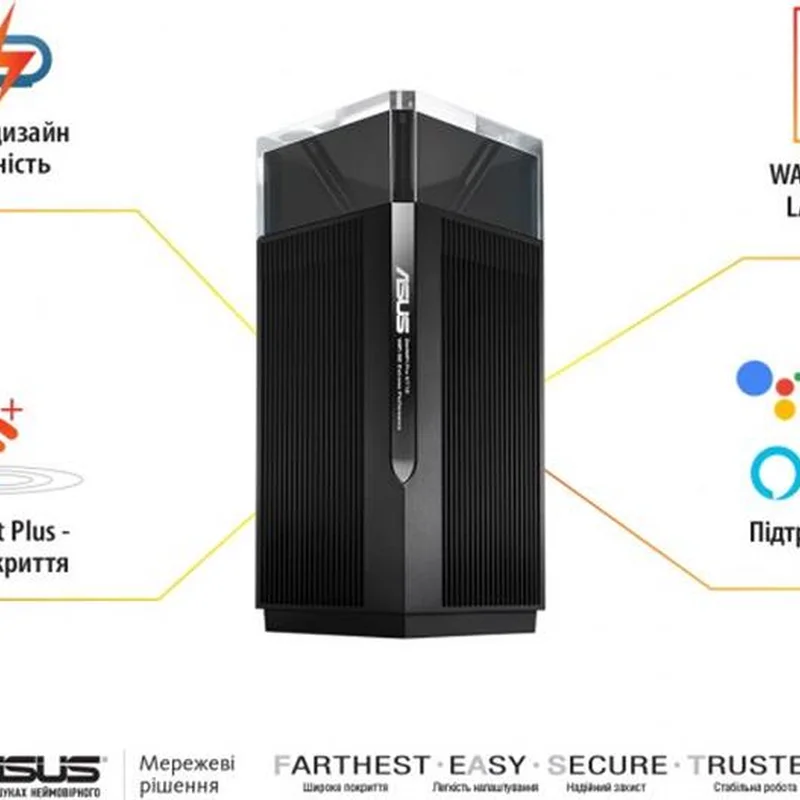 ZenWiFi Pro – це новий еталон сучасної mesh-системи для покриття мережею Wi-Fi всього будинку, що поєднує в собі високу продуктивність і стильне виконання. Працюючи в екосистемі ASUS стандарту Wi-Fi 6E, ця система виводить на новий рівень можливості мережі для продуктивної роботи та цифрових розваг. RangeBoost Plus RangeBoost Plus ZenWiFi Pro - це новий еталон сучасної mesh-системи для покриття мережею Wi-Fi всього будинку, що поєднує в собі високу продуктивність та стильне виконання. Працюючи в екосистемі ASUS стандарту Wi-Fi 6E, ця система виводить на новий рівень можливості мережі для продуктивної роботи та цифрових розваг. Більше потоків, більша пропускна здатність ZenWiFi Pro ET12 – це 12-потоковий пристрій із загальною швидкістю передачі даних до 11000 Мбіт/с. Він відмінно підходить для найбільш завантажених домашніх мереж, де необхідно одночасно передавати та отримувати дані великої кількості пристроїв на високій швидкості та позбутися мертвих зон. RangeBoost Plus RangeBoost Plus - найновіша і найпотужніша версія відомої фірмової технології ASUS RangeBoost, яка покращує покриття для всіх пристроїв Wi-Fi, включаючи застарілі пристрої. Використовуючи флагманський чіпсет Broadcom стандарту Wi-Fi нового покоління та 64-розрядний 4-ядерний процесор із тактовою частотою 2 ГГц, RangeBoost Plus спирається на численні ексклюзивні технології ASUS для розширення радіусу дії сигналу та покриття мережі Wi-Fi (до 38%). Відмінна масштабованість Технологія ASUS AiMesh дозволяє легко додавати додаткові вузли для покращення покриття чи розширення функціональності. Роль вузла може виконувати будь-який AiMesh-сумісний маршрутизатор. Порти LAN та WAN 2.5G Ethernet ZenWiFi Pro ET12 оснащений LAN- та WAN-портом стандарту 2.5G Ethernet, тому ви можете насолоджуватися повною швидкістю 2.5 Гбіт/с по всьому шляху: від провайдера до сумісного пристрою. Новий діапазон 6 ГГц для стабільного backhaul-каналу Через зростання кількості домашніх пристроїв частотні діапазони 5 ГГц та 2.4 ГГц стають все більш переповненими. Але оскільки новий діапазон 6 ГГц зарезервований виключно для Wi-Fi 6E, він створює взаємні перешкоди з пристроями минулих поколінь. Тому він ідеально підходить для використання у ролі магістрального каналу для з'єднання вузлів між собою. Для цієї мети ви також можете використовувати дротове з'єднання Ethernet. Крім того, можна вибрати автоматичний режим та дозволити ZenWiFi Pro ET12 самому вибрати найкращий тип підключення на основі аналізу існуючого середовища. Вибір за вами! Голосове управління ZenWiFi Pro ET12 працює з голосовими сервісами Google та Alexa для керування маршрутизатором. Створено для продуктивності ZenWiFi Pro ET12 розроблений для забезпечення максимальної продуктивності: завдяки новітньому чіпсету та процесору Broadcom пропускну здатність Wi-Fi збільшили до 18%. У пристрої використовуються вісім зовнішніх антен, розташованих під оптимальним кутом у спеціальному прозорому відділенні у верхній частині маршрутизатора. Це дозволяє мінімізувати перешкоди та максимально розширити зону покриття. Інформаційний захист корпоративного класу для домашніх мереж Інформаційна безпека стає все більш важливим аспектом домашніх мереж, у міру того, як до них підключається все більше пристроїв, що особливо не володіють власними антивірусними засобами. Ось чому в ZenWiFi Pro ET12 реалізовано систему захисту від онлайн-загроз AiProtection Pro, яка пропонується абсолютно безкоштовно, без абонентської плати. 