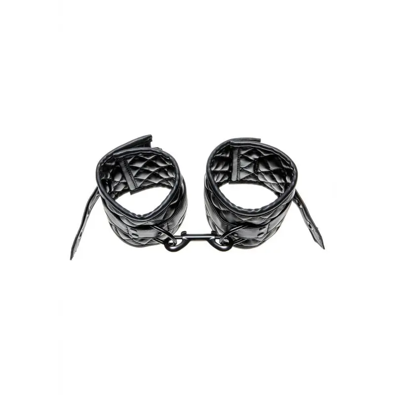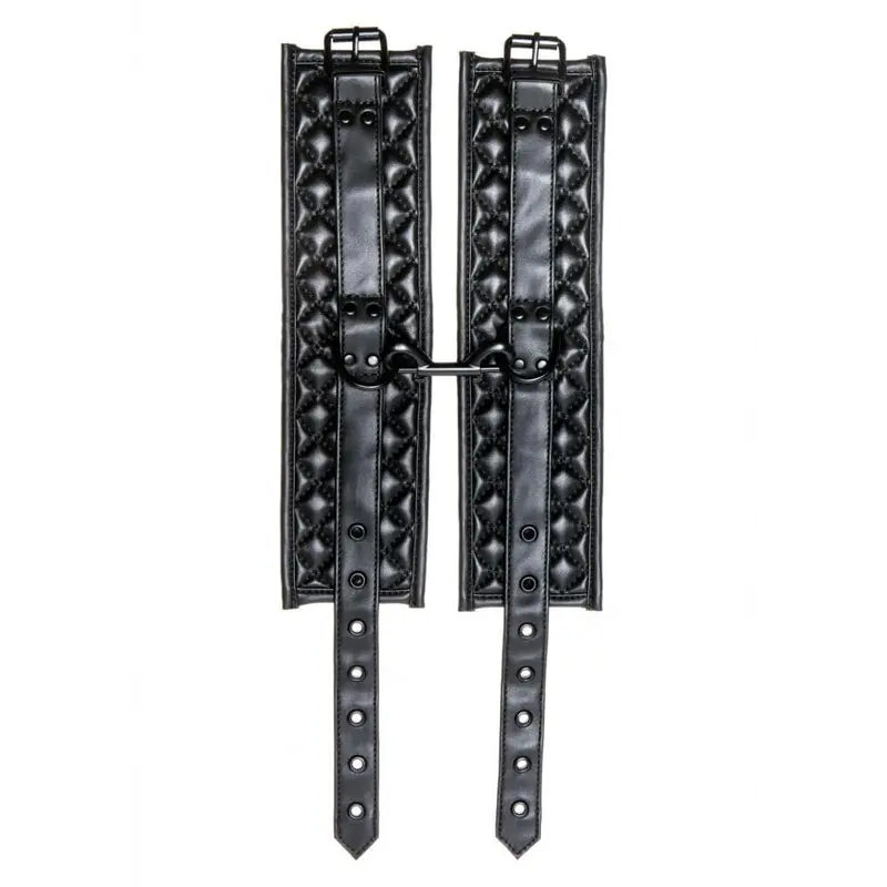Манжеты имеют стеганый рисунок, придающий им уникальный и модный вид. Конструкция оснащена регулируемыми ремнями с пряжкой, что делает этот продукт универсальным. Фетиш-манжеты можно дополнить ошейником с наручниками из этой же коллекции.