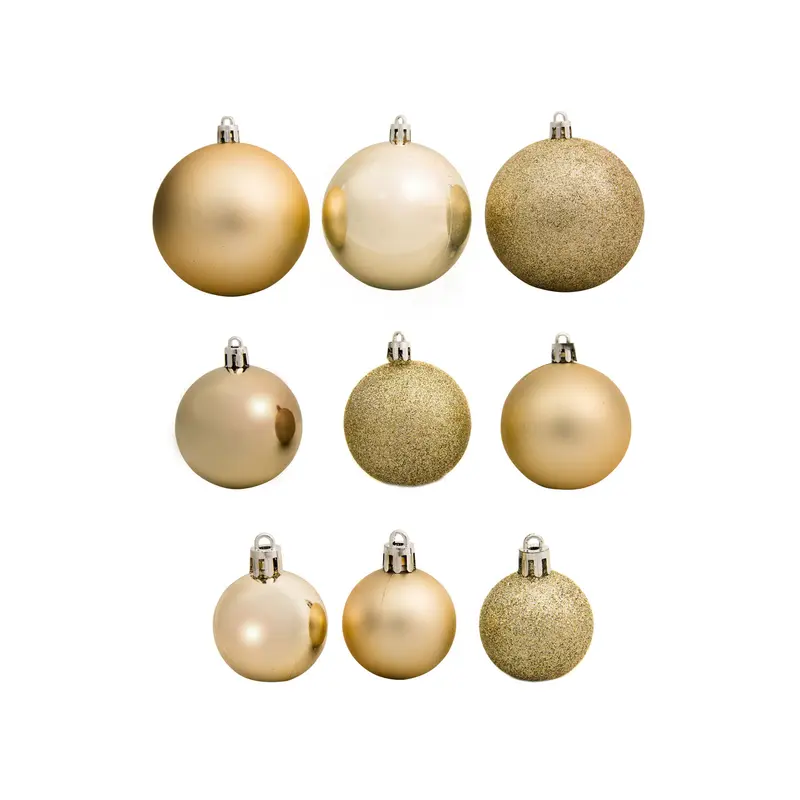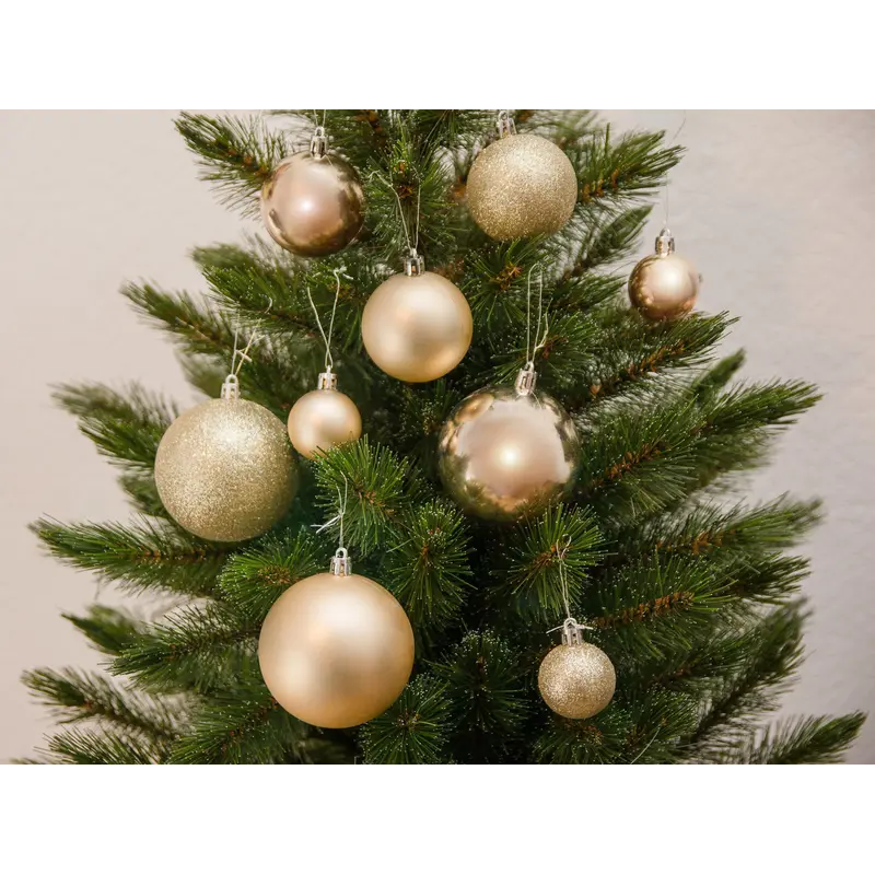 Ялинкові кульки — невід'ємний новорічний елемент декору, без якого складно уявити різдвяну атмосферу. Особливістю набору є різноманіття розмірів та покриттів пластикових кульок, представлених у приємних відтінках шампань, що дозволяє стильно оздобити новорічне дерево у святкову композицію. Залишається лише вдягнути прикраси на вашу ялиночку!