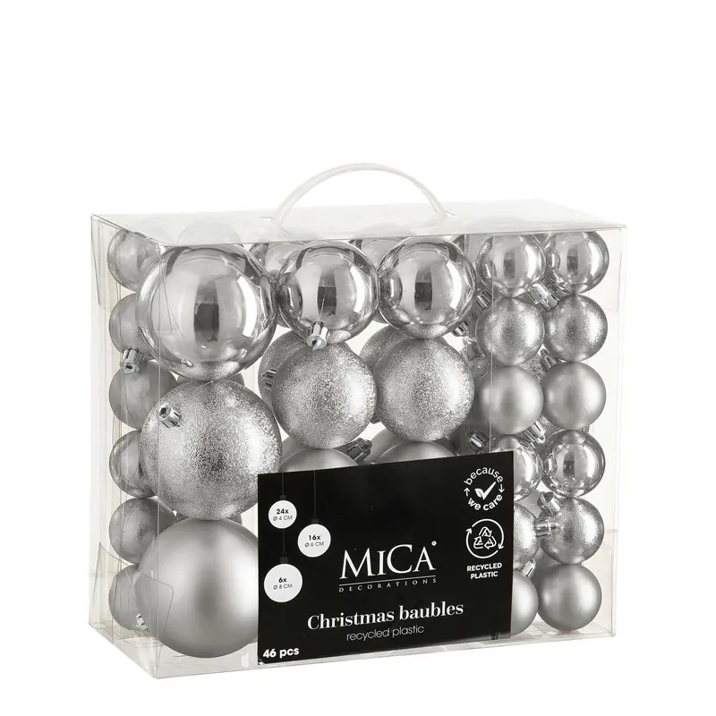 Набір ялинкових кульок і прикрас Mica Decorations у срібному кольорі — це елегантне рішення для створення світлого, вишуканого та гармонійного новорічного декору. У комплекті 60 пластикових прикрас різного діаметра, серед яких кульки Ø 4, 6 та 8 см. Завдяки різноманіттю форм і текстур (матових, глянцевих і з ефектом паморозі), набір дозволяє створити багатошарову, візуально збалансовану композицію на ялинці або в іншому святковому оформленні. Сріблястий колір надає оздобленню легкості та холодної елегантності, добре поєднується з білим, синім, бузковим і пастельними тонами. Усі прикраси виготовлені з легкого та міцного пластику й комплектуються окремими нитками для підвішування.Особливості У наборі 60 прикрас: 24 кульки Ø 4 см, 16 куль Ø 6 см, 6 куль Ø 8 см Три типи оздоблення: глянцеві — з яскравим блиском, матові — з м’якою поверхнею, з ефектом паморозі — з фактурним покриттям Сріблястий колір надає вишуканості, візуальної легкості та гармонійно доповнює будь-який інтер’єр Виготовлені з пластику — легкі, ударостійкі, безпечні у використанні в домівках з дітьми або домашніми тваринами Усі кульки мають нитки для підвішування, які легко закріпити вручну перед використанням Упаковані в прозору пластикову коробку, що дозволяє акуратно зберігати прикраси між сезонамиВаріанти використання Ідеально підходять для оформлення новорічної ялинки у срібно-білій, холодній або мінімалістичній гамі Використовуються для створення настільних композицій, прикрашання вінків, гірлянд чи прозорих ваз Добре пасують до сучасних і класичних інтер’єрів, зокрема в стилях хай-тек, скандинавський або glam Можуть бути чудовим подарунковим набором або основою для святкового декору в домі чи офісі*Реальний колір товару може кілька відрізнятися від зразків, представлених на сайті, в залежності від технічних налаштувань Вашого екрану, а також, враховуючи особливості матеріалу, відтінок товару може змінюватися в залежності від освітлення.*