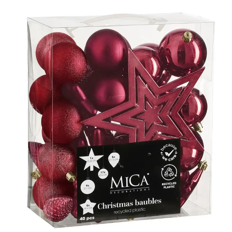 Ялинкові пластикові кульки і прикраси Mica Decorations комплект 40 шт, Ø 8/7/6 см, вишневі