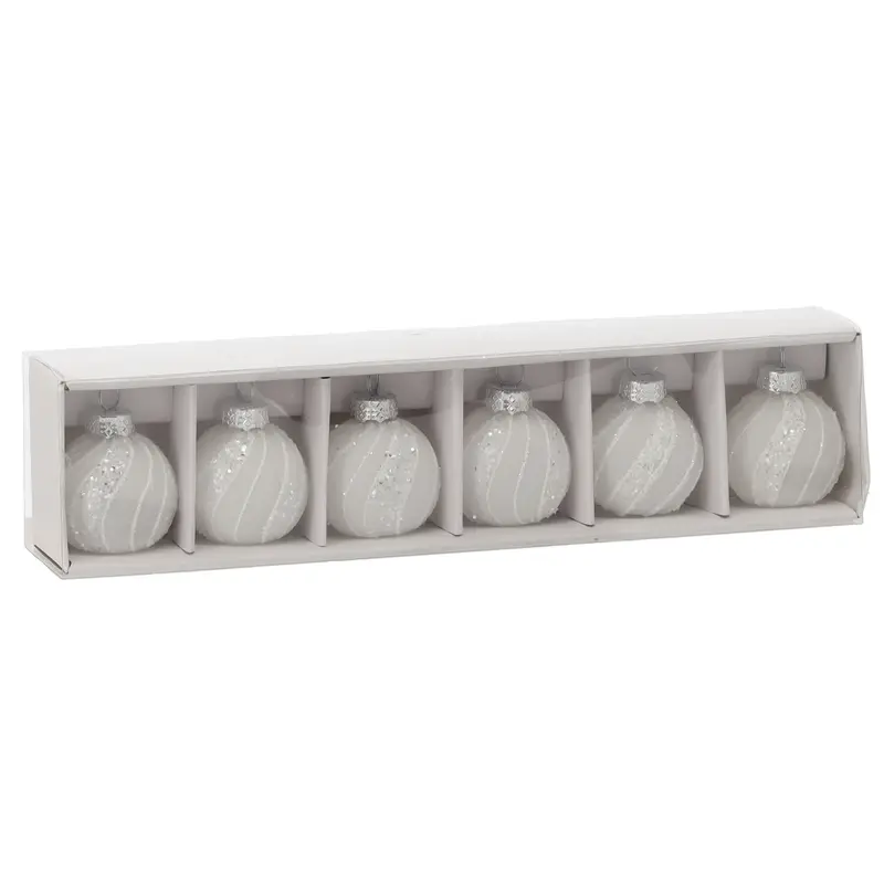 Ялинкові кульки — невіддільний новорічний елемент декору, без якого складно уявити різдвяну атмосферу.У нашому комплекті — 6 білястих скляних кульок маленького розміру у матовому покритті, які особливо вдало виглядають на фоні зеленої хвої, а також впишуться у будь-який інтер'єр. Пласке дно прикрас та хвилястий орнамент із блискіток додають виробам особливої тендітності та шарму, забезпечуючи казкове сяйво при потраплянні світла на кульки. Залишається лише вдягнути іграшки на вашу ялиночку!*Реальний колір товару може дещо відрізнятися від зразків представлених на сайті залежно від технічних налаштувань Вашого екрану, а також, зважаючи на особливості матеріалу, відтінок товару може змінюватися залежно від освітлення.