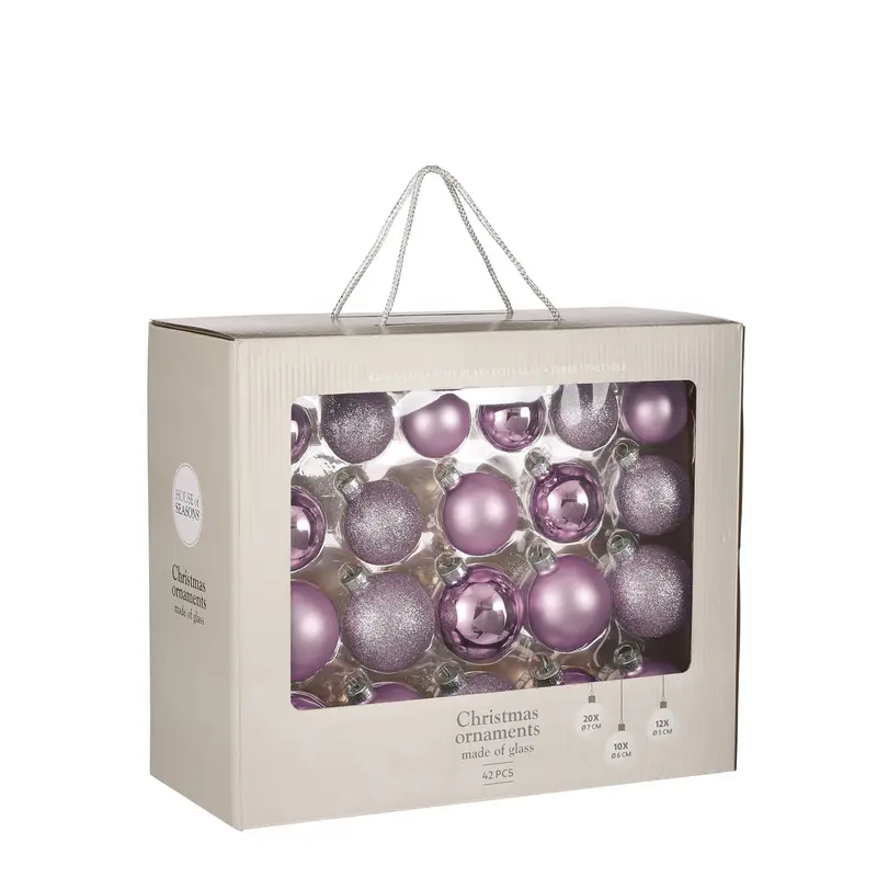 Ялинкові скляні кульки "House of Seasons" комплект 42 шт, Ø 7/6/5 см бузкові