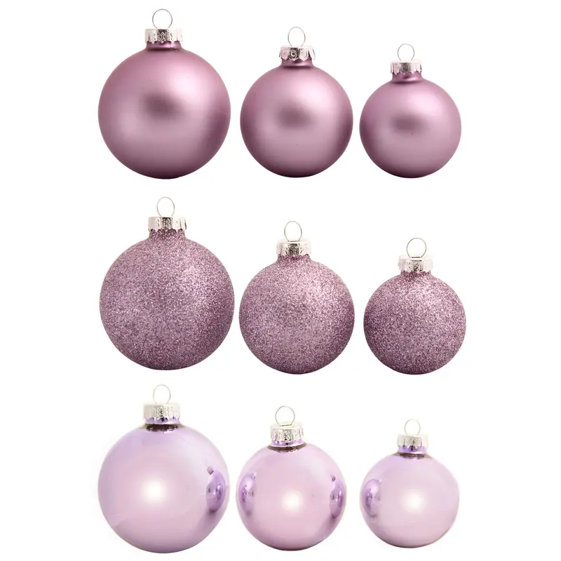 Ялинкові кульки — невід'ємний новорічний елемент декору, без якого складно уявити різдвяну атмосферу. Особливістю набору є різноманіття розмірів та покриттів скляних кульок, представлених у приємних бузкових відтінках, що дозволяє стильно оздобити новорічне дерево у повноцінну композицію: