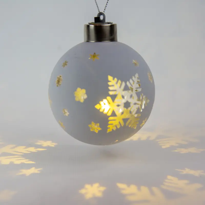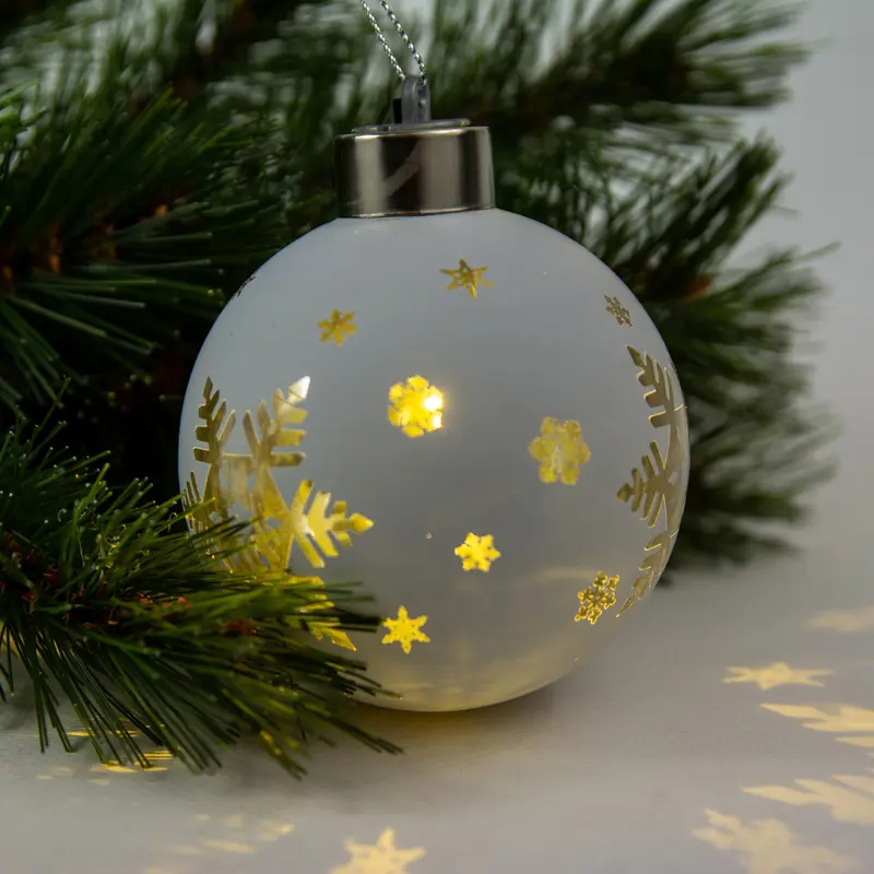 Ялинкова скляна кулька Chomik біла з LED підсвіткою 8 см, сніжинка велика