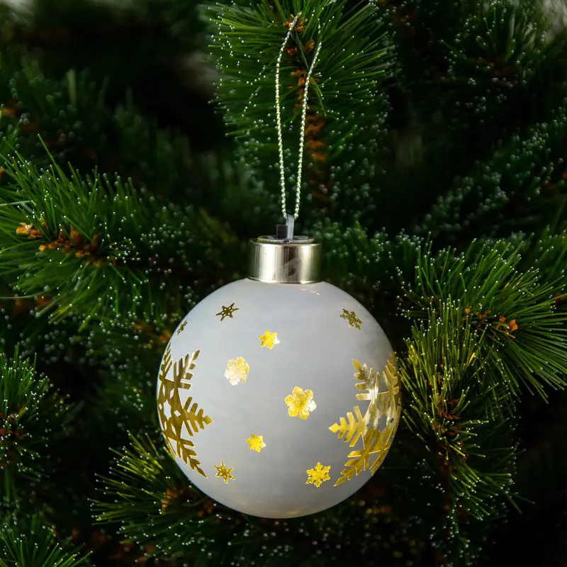 Біла ялинкова кулька зі скла від бренду Chomik — це витончене новорічне оздоблення, яке поєднує класику і сучасні технології. Діаметр виробу становить 8 см, що робить його помітним акцентом на святковому дереві або в композиціях для декору інтер’єру. Особливістю кульки є вбудоване LED підсвічування, яке створює м’яке світіння і підкреслює делікатний малюнок великої сніжинки на поверхні. Кулька виготовлена зі скла, що надає їй елегантності та легкості, а зручне кріплення на нитці дозволяє швидко закріпити прикрасу у потрібному місці. Це поєднання світла, форми і текстури здатне привнести у приміщення атмосферу затишку й зимової казки.Особливості• Скляна конструкція з ретельно нанесеним декором у вигляді сніжинки підкреслює витонченість та легкість виробу, що робить його привабливим акцентом у новорічному оздобленні• Вбудоване LED підсвічування забезпечує тепле світіння, створюючи затишну атмосферу та додаючи глибини дизайну кульки у вечірній час• Компактні розміри у поєднанні з мінімальною вагою дозволяють розміщувати прикрасу навіть на найделікатніших гілках без ризику деформації або пошкодження• Просте кріплення на нитці входить до комплекту, що спрощує монтаж і зберігає цілісність скляної поверхні при навішуванні• Оригінальна упаковка забезпечує безпечне транспортування, а також зручне зберігання прикраси поза сезономВаріанти використання• Прикраса для ялинки в класичному або сучасному стилі, яка завдяки LED підсвічуванню надає додаткову глибину і святковість оформленню• Елемент новорічної композиції на підвіконні або каміні, де кулька підсвічує простір і створює казковий ефект у поєднанні з іншими декоративними елементами• Частина святкової фотозони або декору для вітрини, що приваблює увагу завдяки блиску скла і світловому ефекту• Подарунок або приємний новорічний сувенір, який гарно виглядає у святковій упаковці та підходить для друзів, колег чи близьких*Реальний колір товару може кілька відрізнятися від зразків, представлених на сайті, залежно від технічних налаштувань Вашого екрану, а також, враховуючи особливості матеріалу, відтінок товара може змінюватися залежно від освітлення.